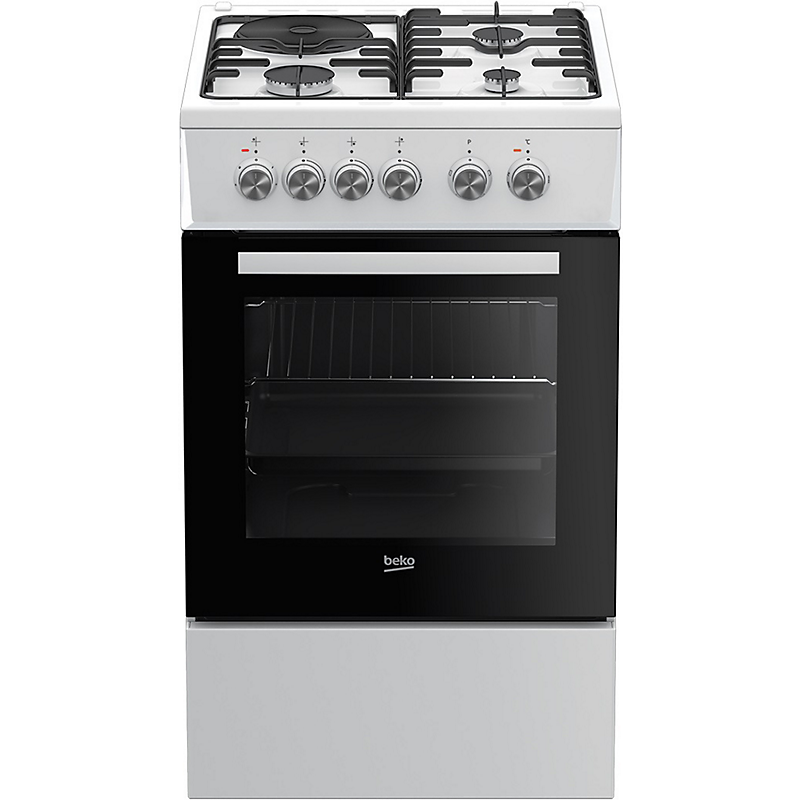 Cuisinière 50 cm mixte 3 feux gaz, 1 électrique, four électrique 60 litres, couvercle en verre, coffre de rangement, 4 fonctions, 1 grille, 1 lèchefrite, coloris blanc