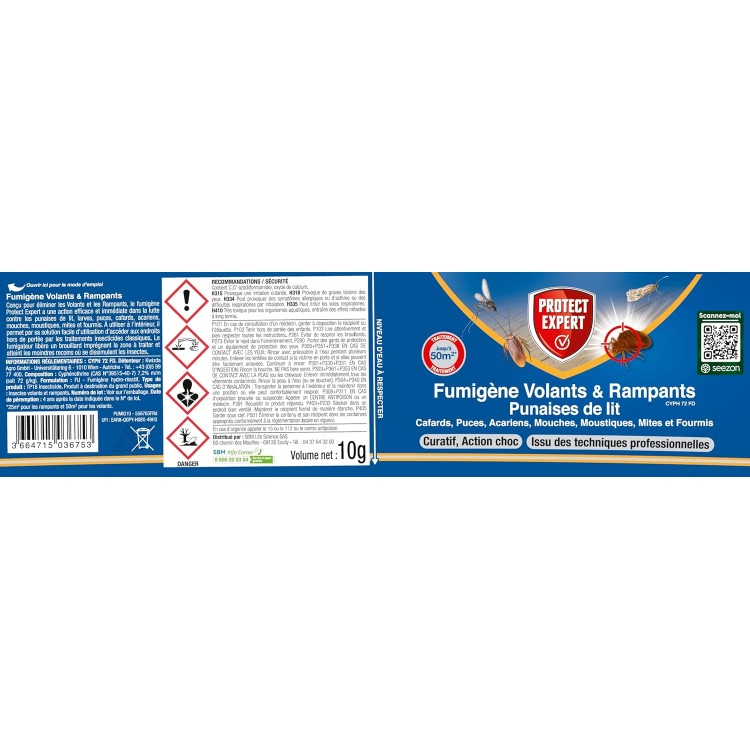 L'efficacité d'un traitement anti-parasitaire repose sur sa capacité à atteindre et éradiquer les nuisibles dans les moindres recoins. Le Fumigateur anti-punaises de lit de 10g excelle dans cette tâche en libérant, dès 30 secondes après son activation, un brouillard dense qui imprègne l'intégralité de la zone ciblée. Conçu pour traiter jusqu'à 25m² ou 65m3 pour les insectes rampants et le double pour les volants, ce fumigateur spécial infestation assure une couverture complète et efficace. Sa formule avancée élimine non seulement les punaises de lit, mais aussi les larves et les acariens, tout en préservant la qualité de votre environnement grâce à l'absence de dépôts visibles et d'odeurs persistantes. C'est une solution de choix pour ceux qui recherchent une méthode de lutte anti-parasitaire à la fois puissante et discrète. Préparation avant utilisationAvant de commencer, assurez-vous de fermer toutes les portes et fenêtres de la pièce à traiter. Ouvrez les armoires et tiroirs pour exposer tous les recoins. Retirez les plantes et assurez-vous que les animaux domestiques sont en sécurité à l'extérieur.Mise en place du fumigènePlacez le fumigène au centre de la pièce. Retirez l'opercule en aluminium et extrayez la capsule du sachet intérieur. Remplissez le gobelet d'eau jusqu'au trait indiqué, puis positionnez la capsule avec la face rouge vers le haut. Quittez la pièce et refermez la porte derrière vous.Activation et temps d'actionLe fumigène commencera à libérer un brouillard 30 secondes après avoir placé la capsule dans l'eau. Laissez agir le produit pendant au moins 4 heures, idéalement 6 heures, pour une efficacité maximale.Nettoyage post-traitementAprès le traitement, aérez la pièce pendant 30 minutes. Passez l'aspirateur soigneusement pour éliminer tous les insectes morts et leurs larves. Placez le sac de l'aspirateur dans un sac plastique hermétique avant de le jeter. Si la pièce traitée est une chambre, attendez 6 heures avant de la réutiliser. N'oubliez pas de laver votre linge de maison à 60°C pour éliminer toute trace d'insectes.