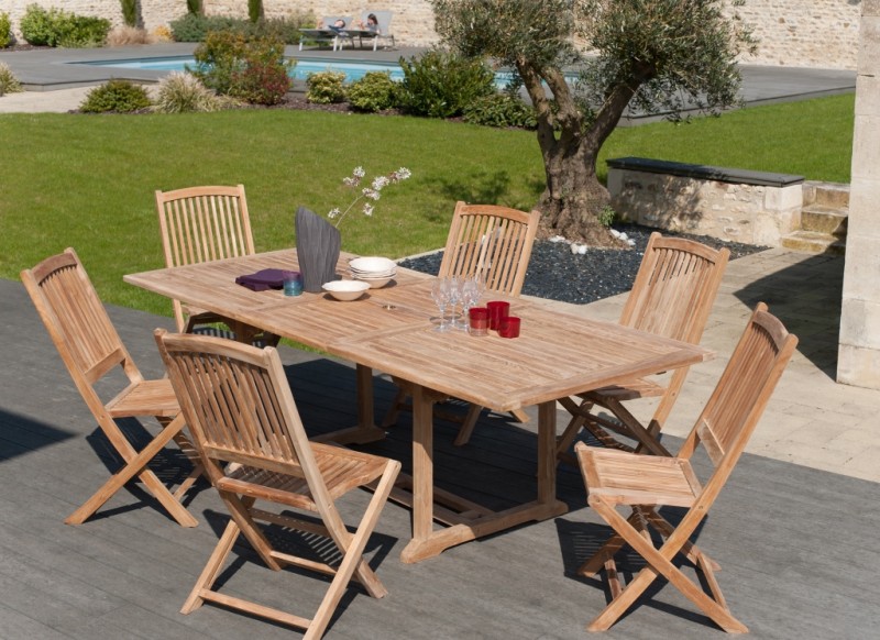 Le teck est un bois précieux et imputrescible très utilisé pour la fabrication de meubles de jardin car il est extrêmement résistant aux agressions climatiques les plus rudes et constantes (humidité). Nos meubles de jardin sont en teck massif de première qualité, ce qui exclut principalement les défauts et offre une finition qualitative. Les plantations Le bois utilisé dans la fabrication de nos meubles de jardin provient uniquement de forêts de replantation provenant de l'île de Java. Ces forêts sont gérées par l'organisme d'état Perum Perhutani, qui détermine une saisonnalité et un quota de coupe afin d'assurer la durabilité de la ressource. L'entretien Les meubles en teck peuvent rester à l'extérieur sans aucun traitement particulier. Après quelques mois voire quelques années, le bois prendra une teinte grisée. Pour conserver la couleur initiale de votre meuble ou pour retirer une tache, poncez légèrement ce dernier avec un papier de verre fin. Vous pouvez également appliquer une huile de teck en début de saison, il sera ainsi protégé et de couleur miel. Il est fortement conseillé d'abriter ce mobilier et de le protéger du gel pendant la période hivernale afin qu'il ne s'abîme pas. Meuble monté, pieds à visser