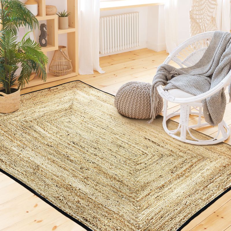 Sublime tapis tressé en jute et coton parfait pour rendre une ambiance chaleureuse et ethnique.