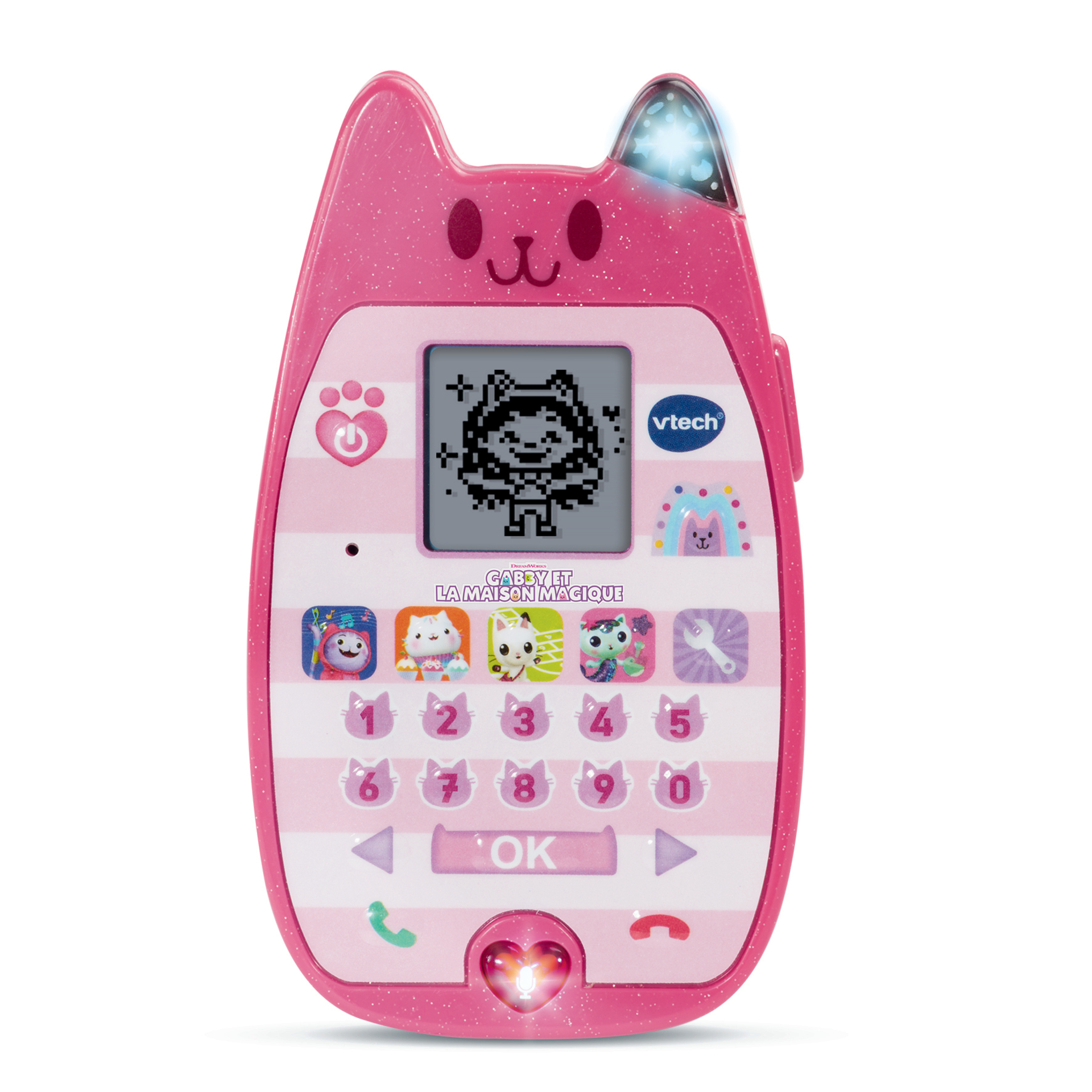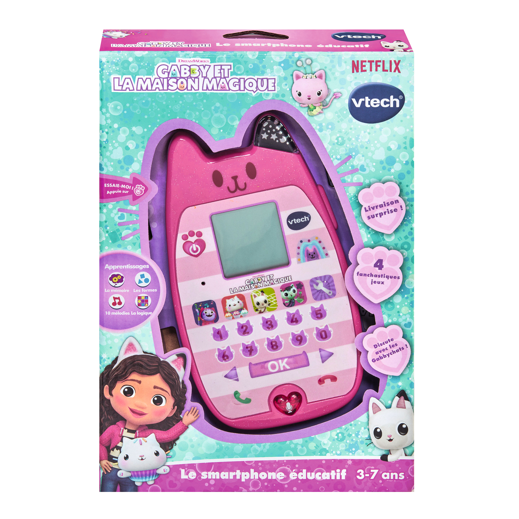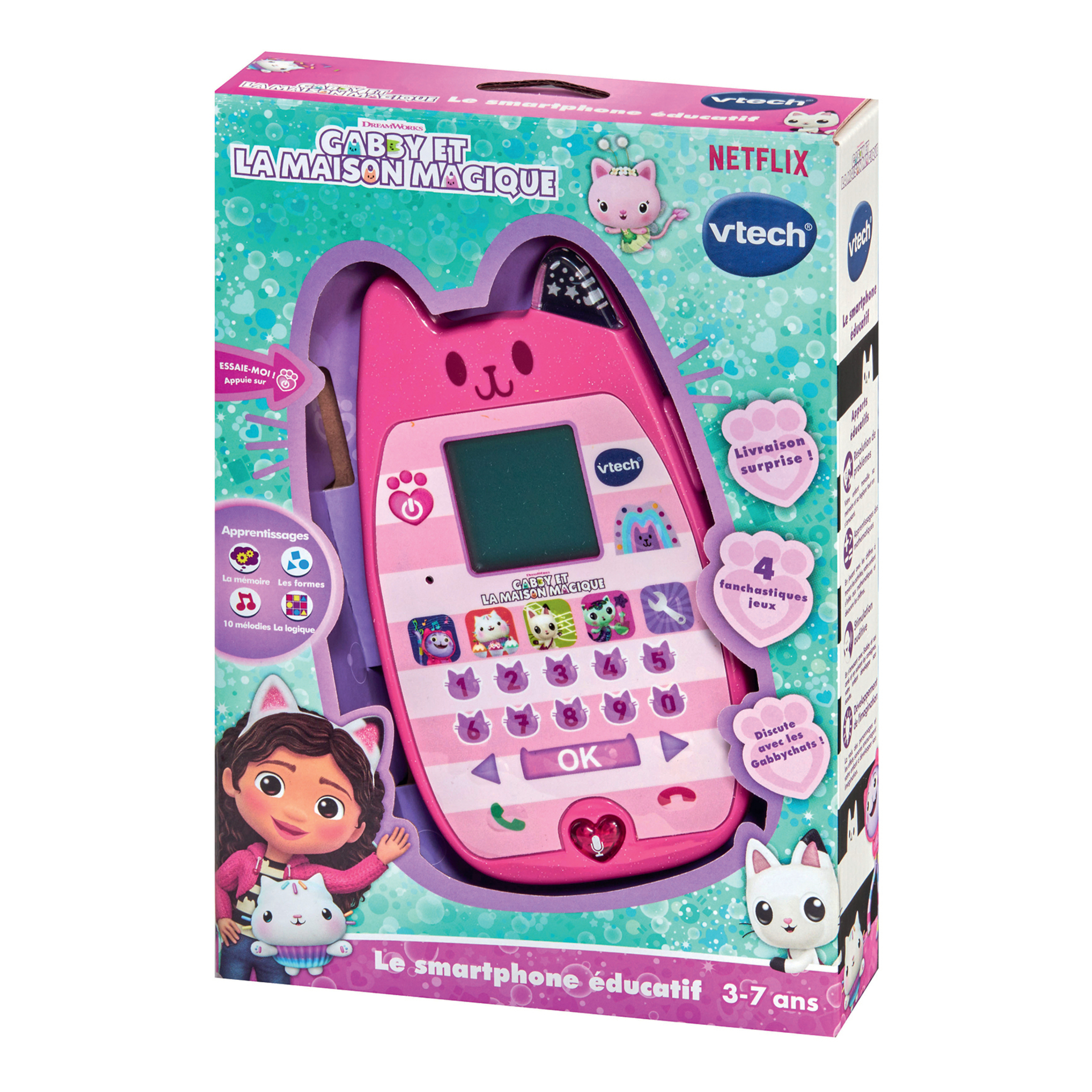 Gabby et la maison magique - Le smartphone éducatif - 3 - 7 ans Un smartphone fan-cha-stique qui s'illumine et ressemble à celui de Gabby ! L'enfant discute avec les personnages de la série et s'amuse avec P'titchou, Dj Miaou, Pandy Pattes et Gabby à travers des jeux for-miaou-dables ! - 4 jeux pour s'amuser en musique, préparer un gâteau avec P'titchou, jouer à la marelle avec Pandy ou préparer une potion avec Marine. - 1 bouton Livraison surprise pour écouter des messages de Gabby et découvrir ses amis. - 1 bouton Discussion avec les Gabbychats pour imiter une conversation avec Gabby et Pandy Pattes. - Un clavier à 10 chiffres pour jouer aux activités. - Un bouton Réglages pour choisir une sonnerie, régler le contraste de l'écran et activer ou désactiver la musique de fond. Arrêt automatique. Boîte Try-me. Fonctionne avec 3 piles LR03 fournies.
