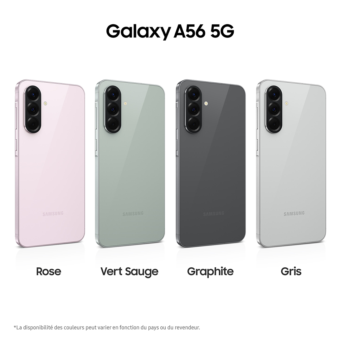Le Samsung Galaxy A56 5G combine design sophistiqué, puissance et intelligence pour s’adapter à tous vos besoins. Son écran Super AMOLED 6.7’’ FHD+ vous plonge dans une expérience visuelle immersive, idéale pour vos films, jeux et réseaux sociaux. Boosté par l’IA, il simplifie votre quotidien : Entourer pour chercher vous permet d’accéder instantanément aux informations,Gemini vous assiste dans vos tâches. Profitez d’outils de retouche photo intelligents comme Effaceur d’objet, Meilleure Pose ou encore Montage par IA qui améliorent vos clichés en un clin d’oeil. Son triple capteur photo et sa caméra selfie 12 MP HDR garantissent des clichés nets et détaillés, de jour comme de nuit. Propulsé par le processeur Exynos1580 et 8 Go de RAM, le Galaxy A56 5G offre une fluidité optimale. Profitez aussi de 6 générations de mises à jour OS et 6 années de mises à jour sécurité, pour un smartphone toujours performant et protégé. Et avec jusqu’à 2 jours et demi d’autonomie et une charge ultra rapide 45W, il vous accompagne partout, sans contrainte. Un smartphone qui s’adapte à vous, prêt à relever tous vos défis. Découvrez le Galaxy A56 5G dès maintenant.