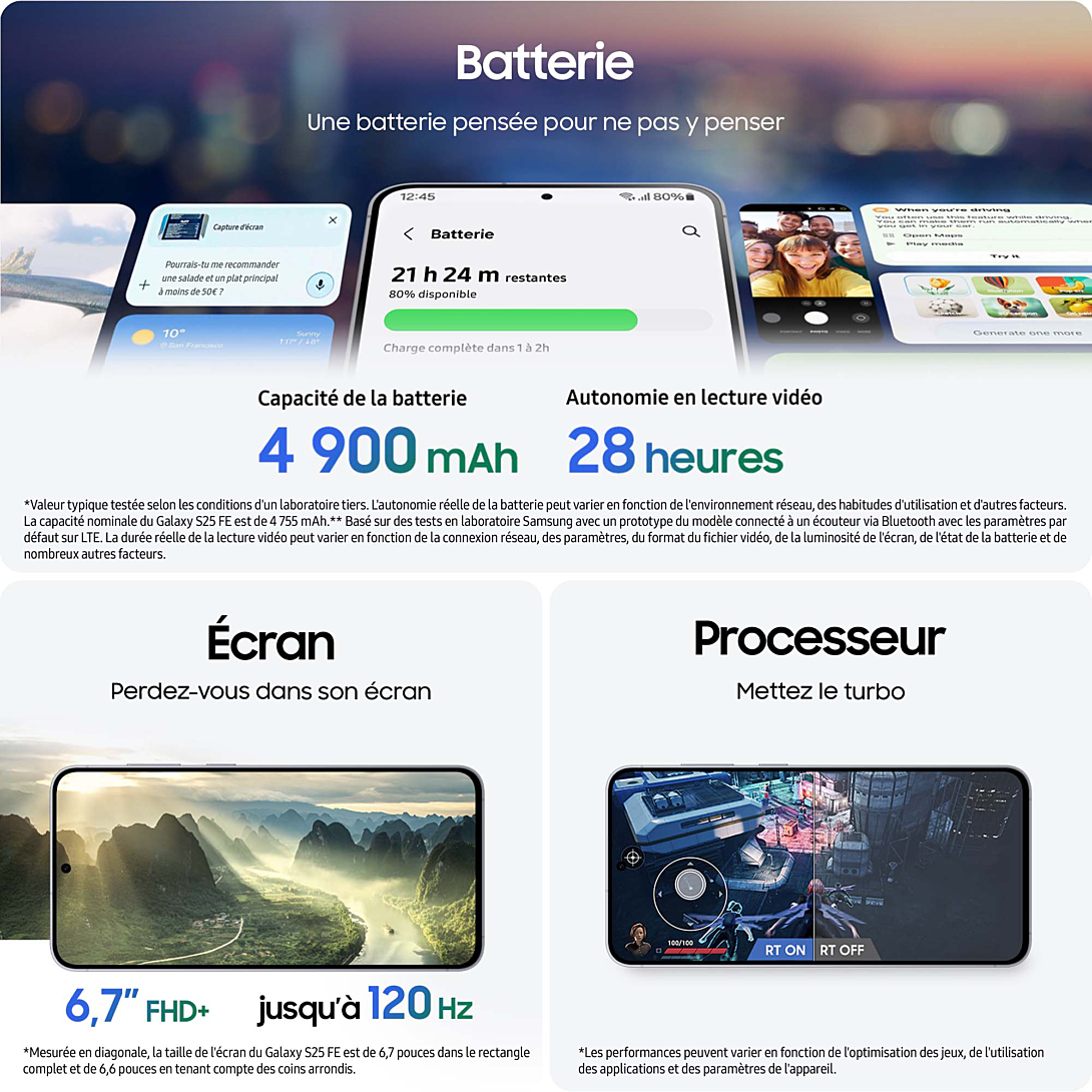 [Cet avis a été recueilli en réponse à une offre.] Fidèle des produits samsung j ai changé mon S20Fe pour le 25Fe pas déçu je recommande ce téléphone rapport qualité prix