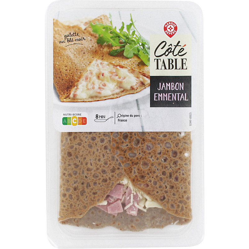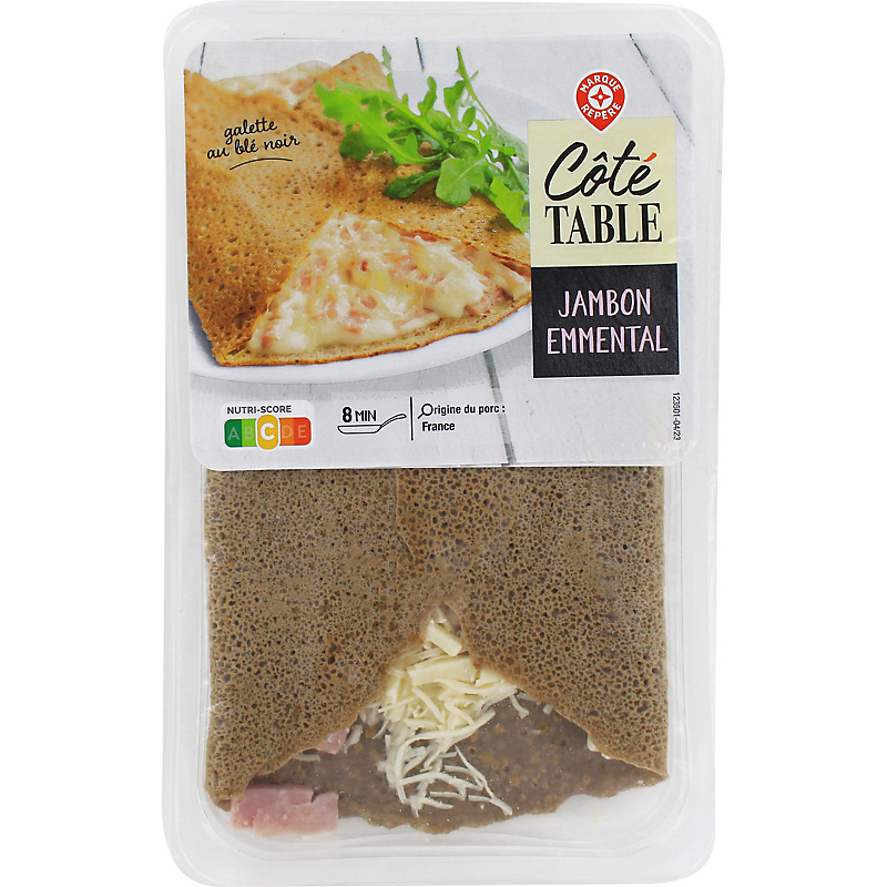 Galette de blé noir garnie de jambon cuit standard, aromatisé, d'emmental et de mozzarella COTE TABLE