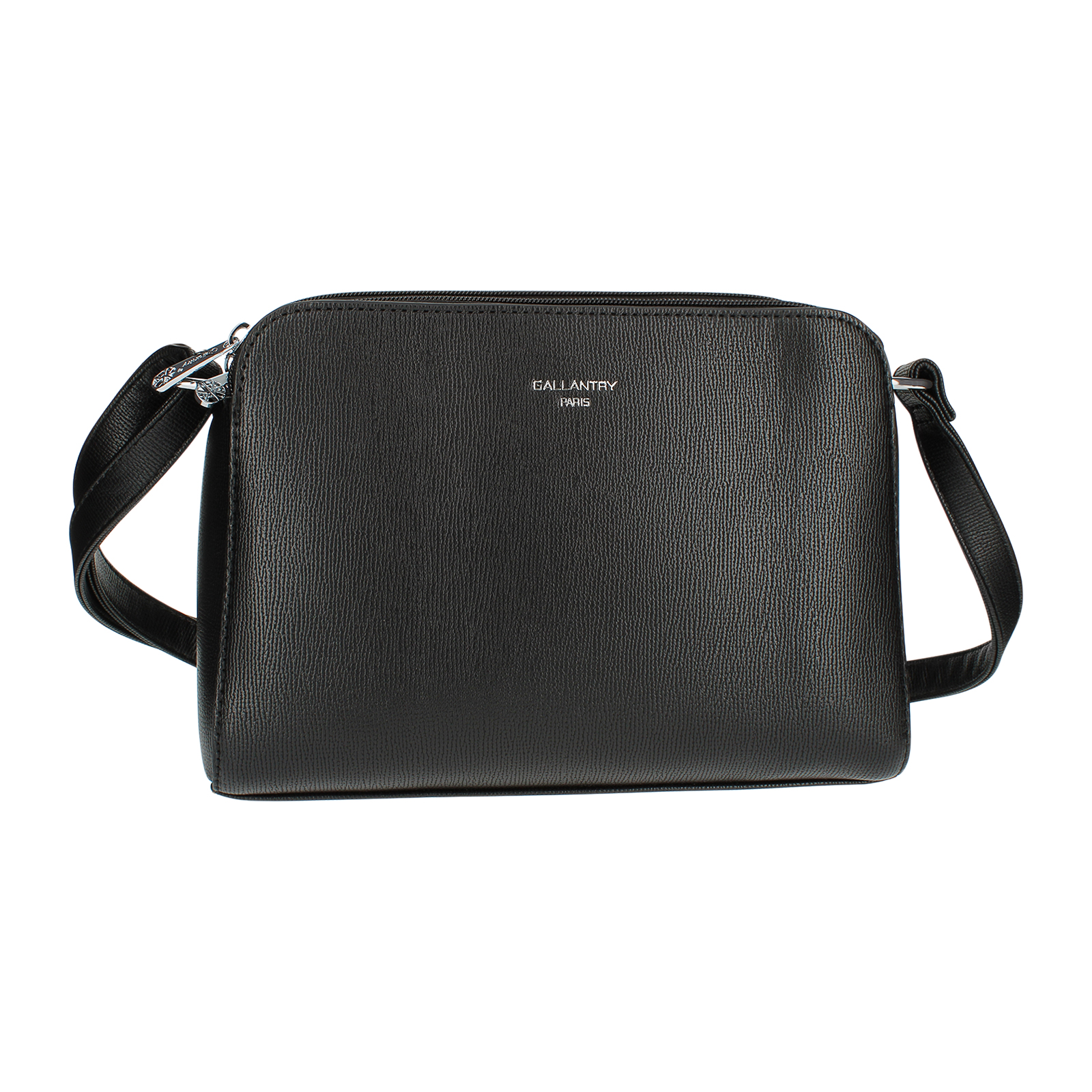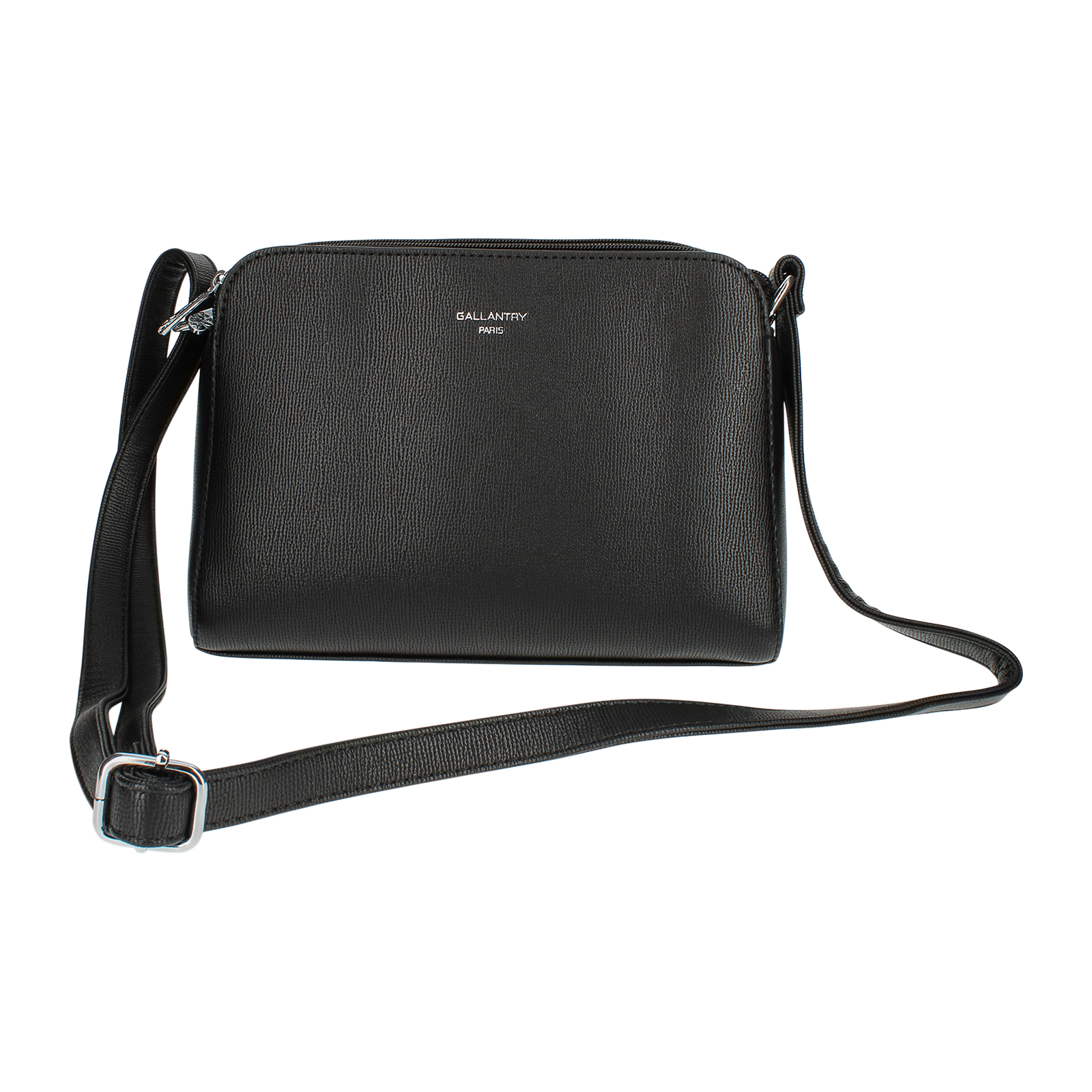 Sac à bandoulière Gallantry Paris. 3 compartiments, un grand au milieu et deux moyen sur les cotés. Poche à l'intérieur du grand compartiment et une petite poche à fermeture éclair sur le derrière du sac. Dimensions : 26 x 19 x 11 cm.