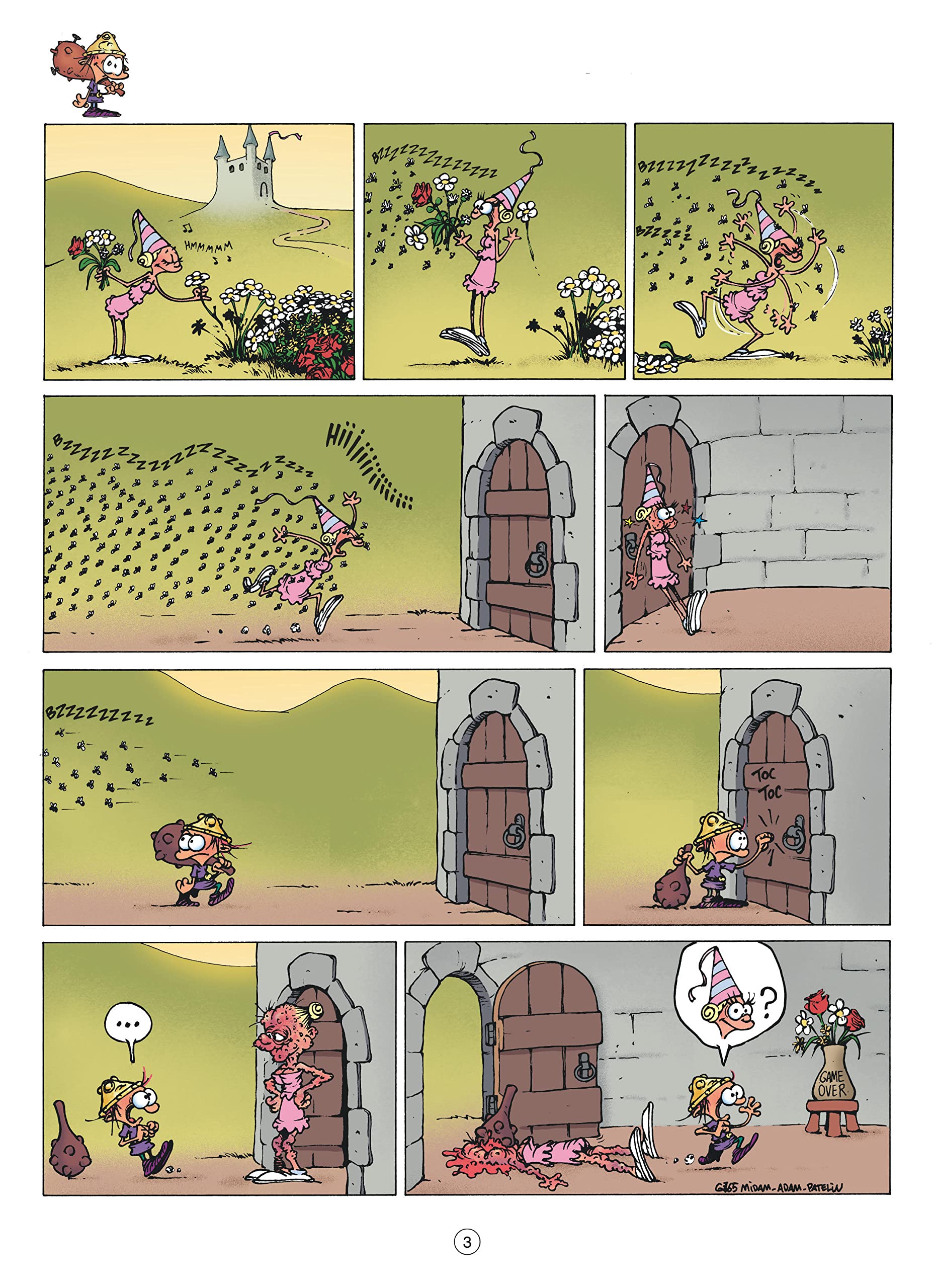On fait difficilement plus simple comme jeu vidéo : un petit héros particulièrement maladroit, une princesse stupide, hystérique et presque aussi gaffeuse que son sauveur, et puis un tas de Blorks plus laids, cruels et vicieux les uns que les autres, qui n'ont qu'un but dans leur vie virtuelle : empêcher le premier de délivrer la seconde. Et si, au passage, ils peuvent les massacrer joyeusement, ils ne vont pas se gêner, entraînant ainsi l'inéluctable "Game Over" qui rythme chaque fin de page de la série. C'est sur ce canevas pourtant simple que Midam nous régale de gags muets et gore d'une efficacité redoutable.