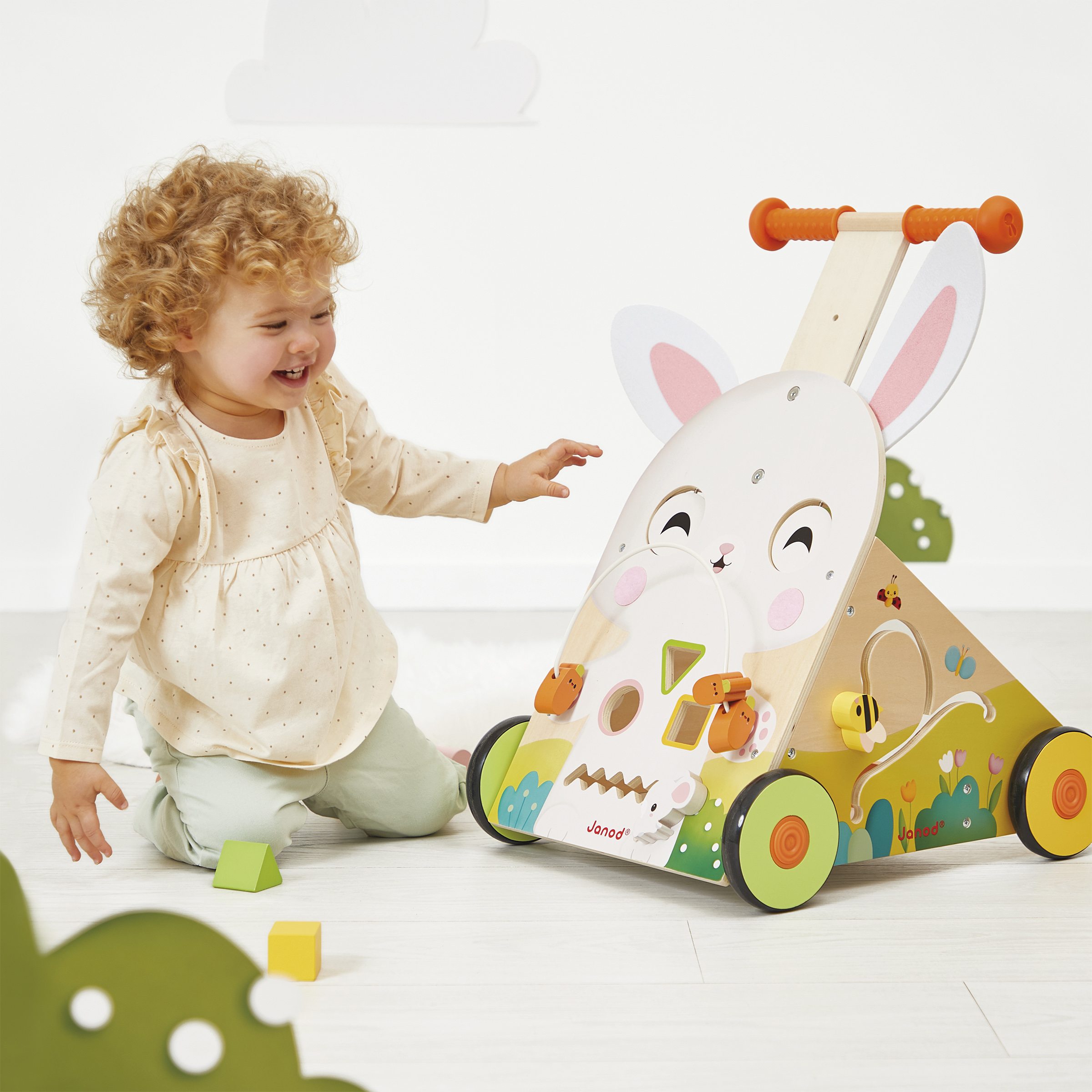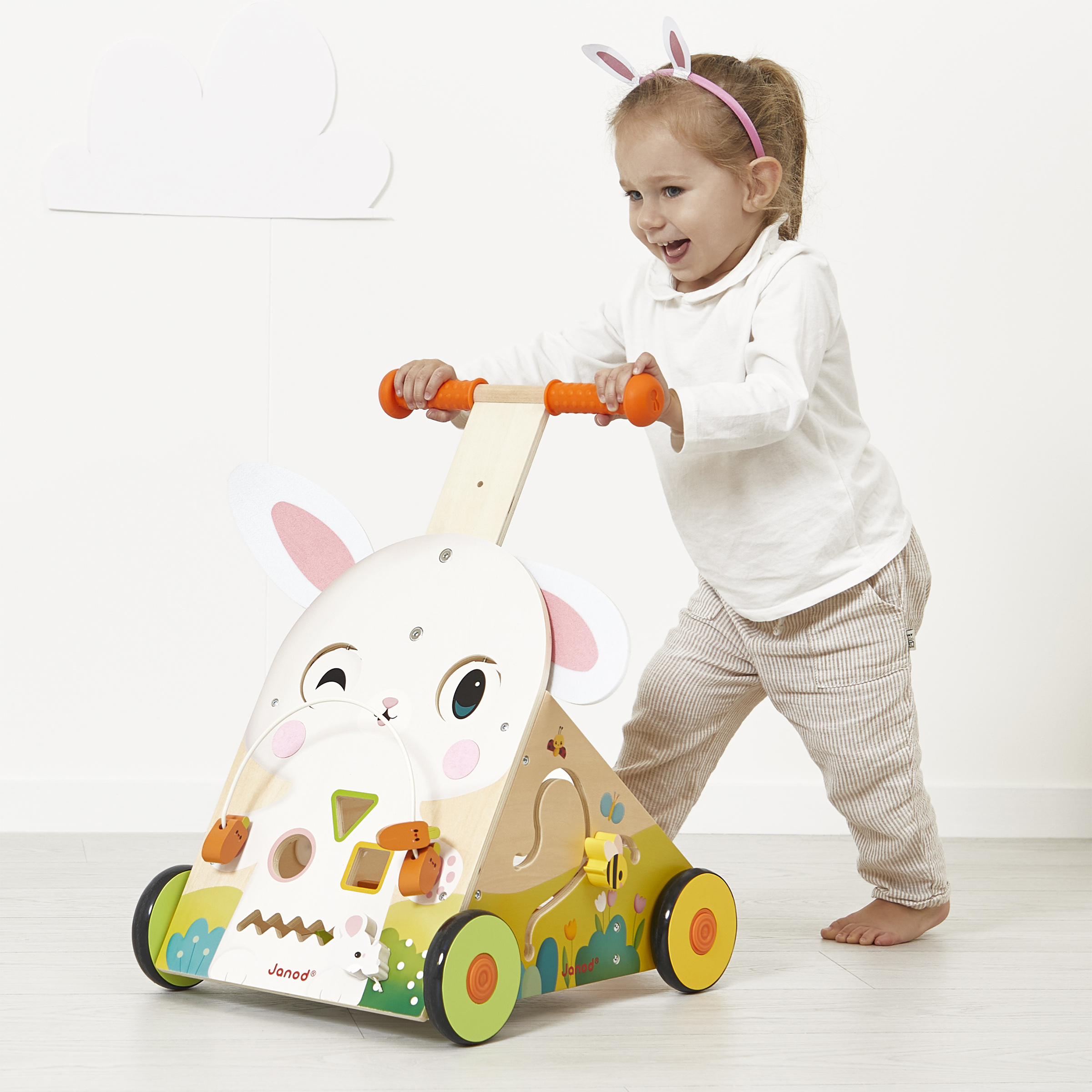 Qui veut faire un tour avec monsieur lapin ? Voici un joli chariot multi-activités, à pousser, pour partir à l'aventure. Grâce à sa poignée ajustable en hauteur (46 cm à 53 cm), ce chariot est évolutif et s'adapte à la taille de votre enfant. Idéal pour apprendre la marche en douceur, il est équipé d'un système de frein facilement réglable au niveau des roues (3 positions : arrêt - vitesse réduite - vitesse normale). En plus de la marche, votre enfant pourra développer sa motricité fine et sa dextérité avec les 9 activités ludiques proposées : looping carottes, boite à formes, balade de la souris, yeux rotatifs, oreilles en feutrine amovibles, joues en feutrine, engrenages, soleil rotatif sonore et labyrinthe de l'abeille. Jouet d'éveil en bois FSCTM. Pour les enfants à partir de 12 mois.