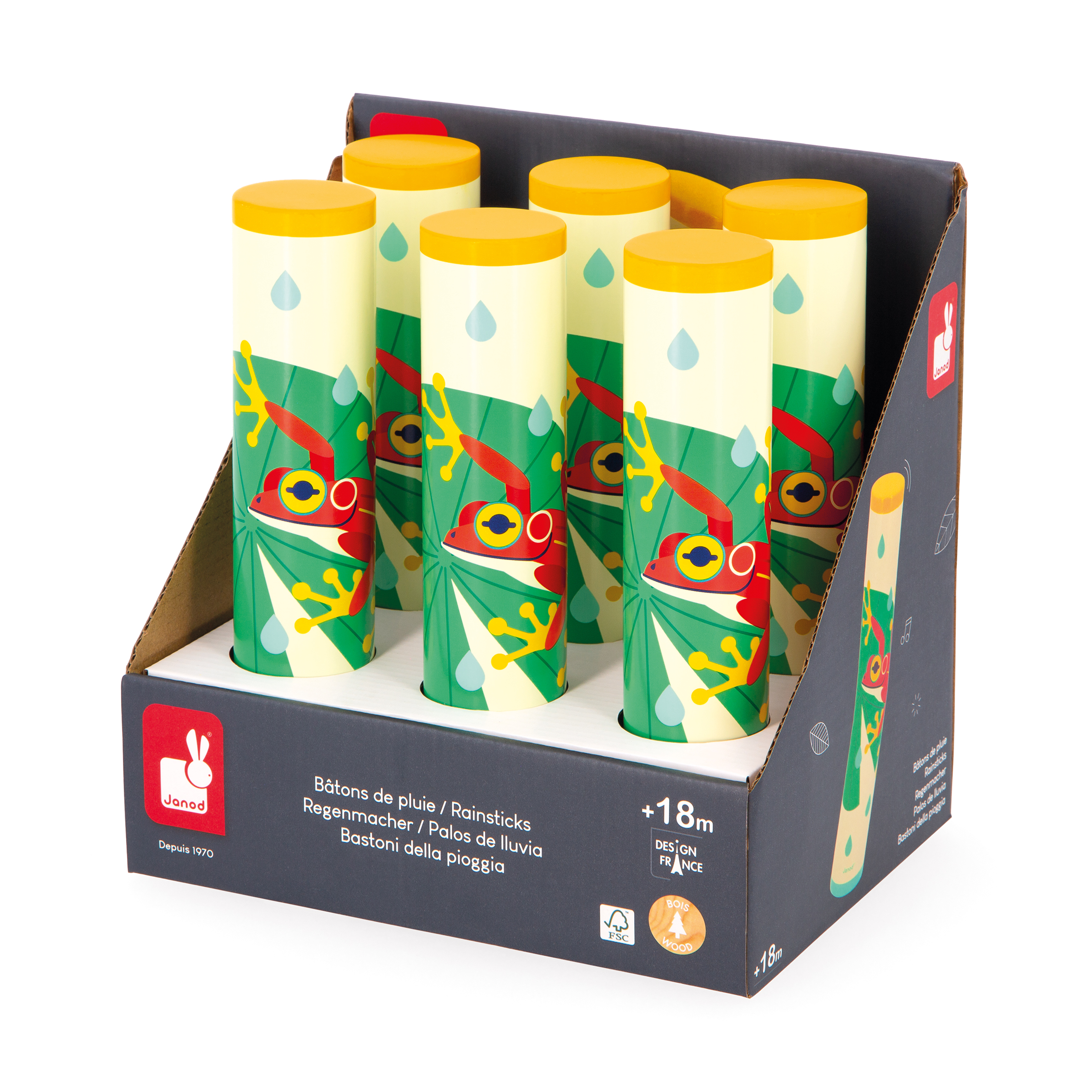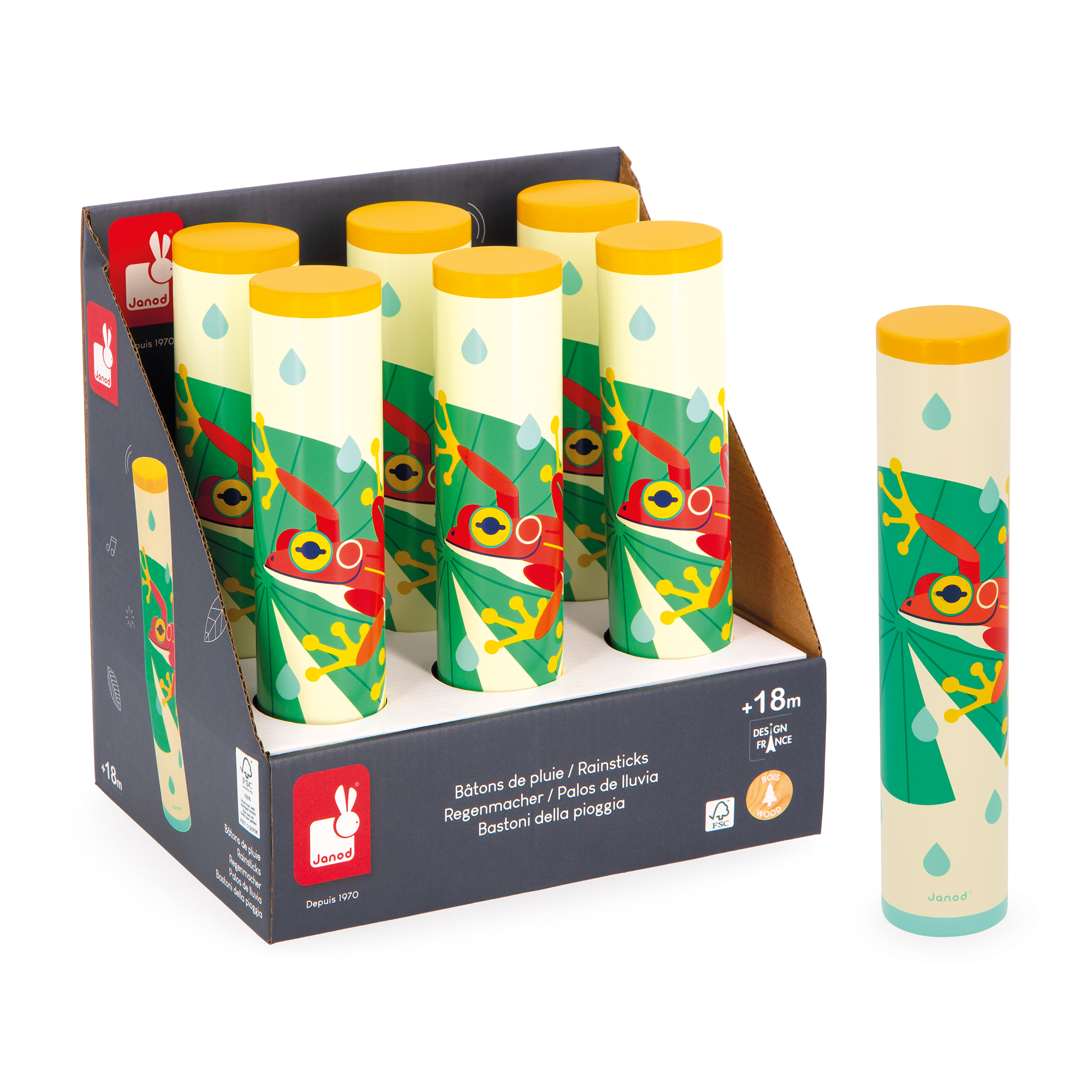 Imaginez-vous au bord de l'étang, un après-midi calme, et relaxez-vous avec votre enfant au son du bâton de pluie Janod. Votre enfant pourra l'écouter, encore et encore, simplement en le retournant. Eveil les sens et stimule la découverte musicale. Vendu en display de 6 bâtons de pluie. Jouet d'éveil musical en bois FSCTM. Pour les enfants à partir de 18 mois.