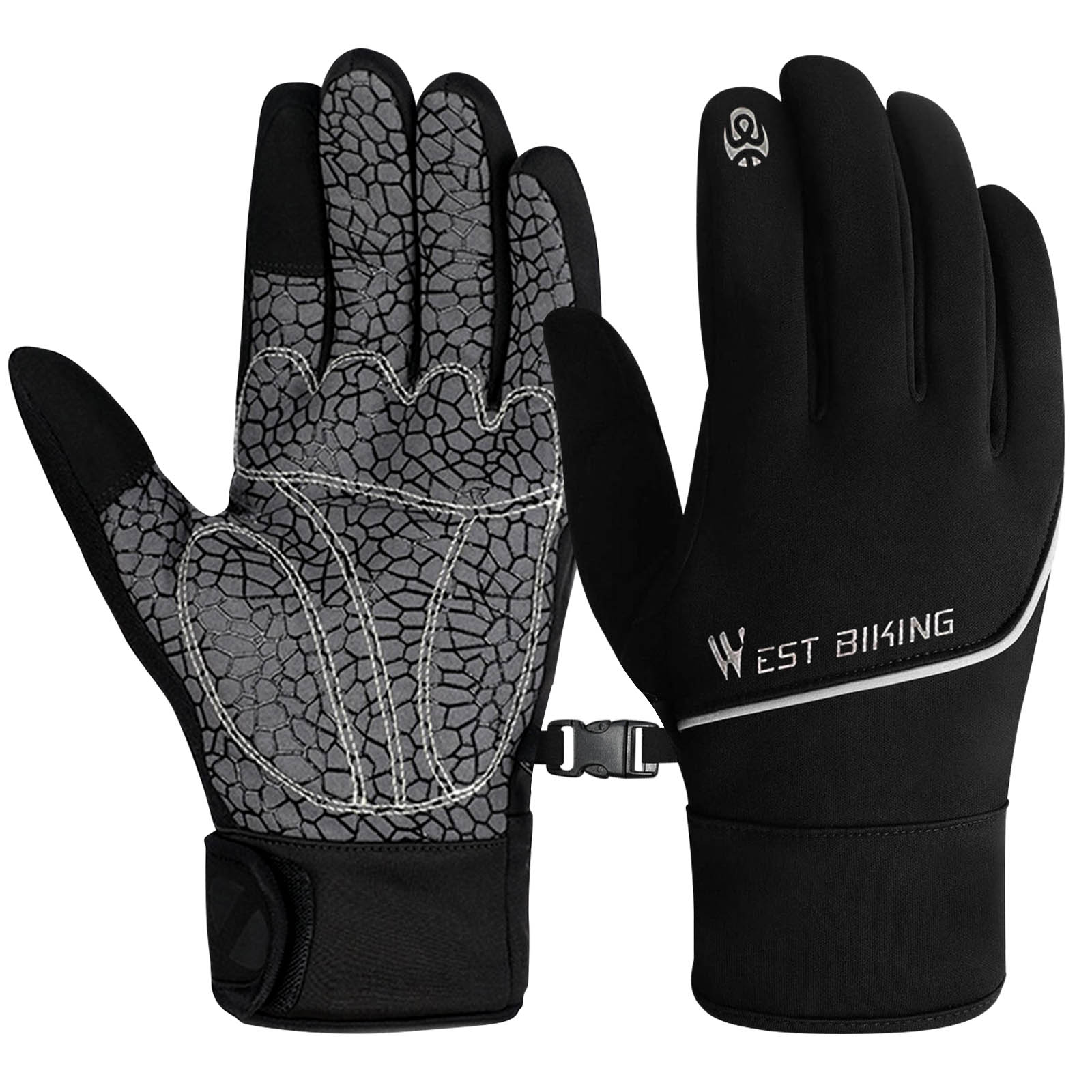 Gants de sport tactiles Série West Biking. Paume antidérapante. Fonction tactile sur le pouce et l'index. Fluidité tactile conservée. Matière chaude et douce. Bandes réfléchissantes. Clips intégrés. Taille L pour tour de main jusqu'à 22cm.