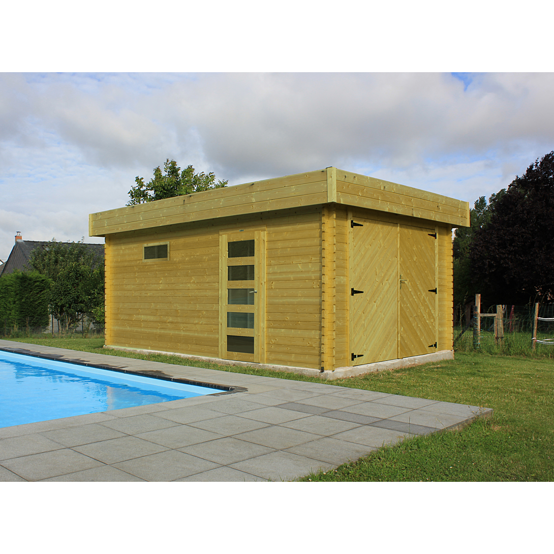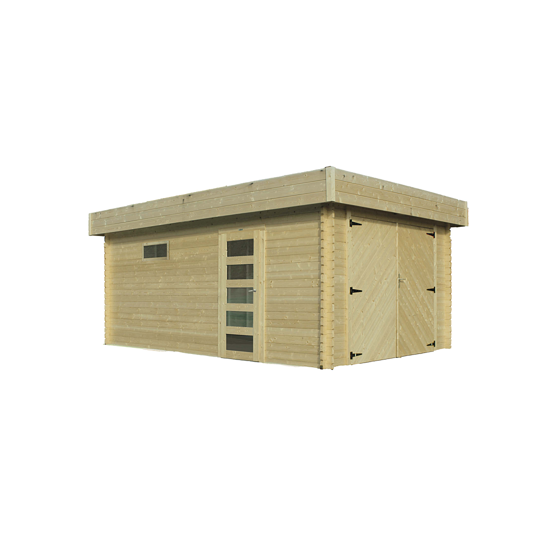 Le système traditionellement utilisé dans la construction de chalets de jardin: des profilés en bois dotés de languettes et de rainures qui s'emboitent les uns dans les autres. Fournis avec une toiture en planchettes 16 mm et un feutre bitumeux noir. Verre trempé transparent. Serrure à clefs avec une sécurité enfant. Kit de ventilation. Seuil en aluminium très fin ce qui facilite le passage avuc un vélo ou une tondeuse. Libre choix de la position de la porte de service et de la fenêtre.