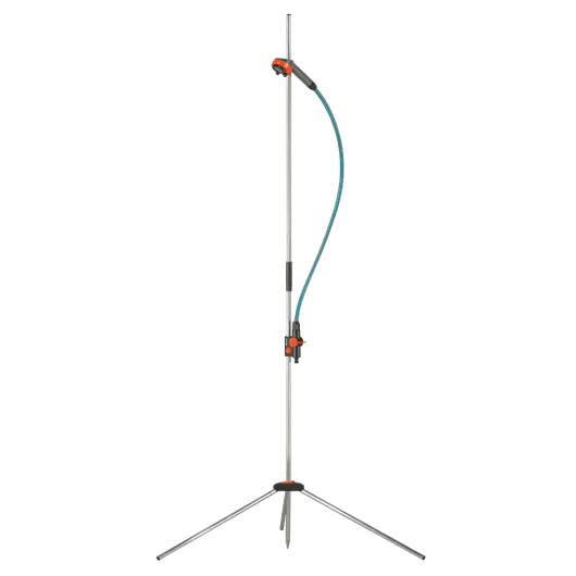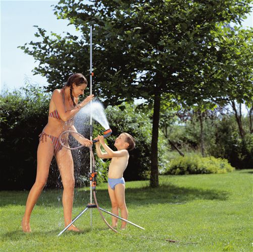 Une douche de jardin de grand confortAvec la douche de jardin trio GARDENA prendre une douche en plein air devient aussi agréable que dans la salle de bains. Le trépied facilite l'installation de la douche à n'importe quel endroit. La pomme de douche flexible et amovible qui est reliée à un tuyau de 13 m confère plus de liberté pour se doucher au jardin. Vous pouvez choisir entre deux formes de jets : le jet doux en éventail pour se doucher ou le jet brumisateur pour un agréable rafraîchissement. Sa hauteur est entièrement réglable à l'aide d'un simple bouton-pression afin de s’adapter à la taille de chaque utilisateur. La vanne de régulation et d'arrêt permet de réguler le débit en fonction de la quantité d'eau souhaitée. Hauteur maximale : 220 cm.