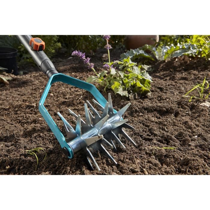 Préparation des lits de semences et ameublissement du solIl permet d'émietter facilement le sol grâce à la forme des roues étoilées ce qui est particulièrement important pour l'ensemencement. Il est fabriqué en acier de haute qualité et les 4 roues sont zinguées. L'émietteur s'adapte à tous les manches Combisystem GARDENA. Nous recommandons une longueur de manche de 150 cm en fonction de la taille de l'utilisateur. La garantie est de 25 ans.