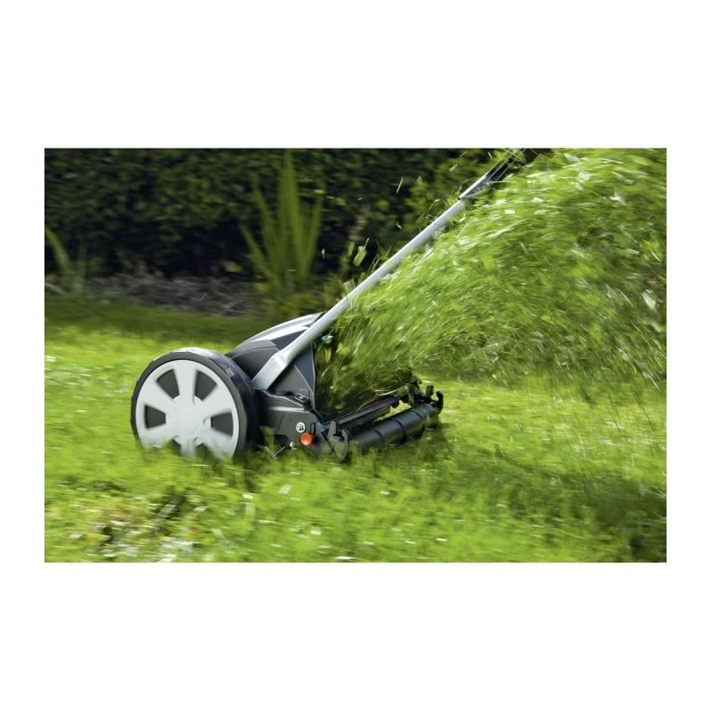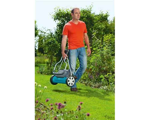 Le principe de la tondeuse hélicoïdale à main 400 C Comfort GARDENA est simple. Lorsque vous poussez, le cylindre de coupe et la lame inférieure se déplacent sans se toucher. Tout comme avec des ciseaux, le brin d'herbe est relevé puis coupé. Caractéristique particulière: puisque le cylindre de coupe et la lame inférieure ne se touchent pas, le travail est plus agréable et silencieux et la poussée s'en trouve facilitée. Le cylindre de coupe est en acier trempé de qualité et doté d'un revêtement anti-adhérence. La lame inférieure bien affûtée garantit une coupe nette et précise permettant un excellent entretien de la pelouse. La tondeuse hélicoïdale à main GARDENA 400 C est équipée de nombreux éléments de confort qui rendent votre travail plus simple et plus agréable. Les larges roues à bande de roulement spéciale et leurs composants en plastique souple simplifient considérablement la conduite et permettent une meilleure adhérence à la pelouse. Grâce à son guidon de forme ergonomique, la tondeuse hélicoïdale à main est facile à pousser. Petit plus bien pratique: le guidon repliable équipé d'un élément à verrouillage rapide vous permet de replier la tondeuse simplement et rapidement. La hauteur de coupe souhaitée se règle facilement grâce à un régulateur et à une graduation de contrôle bien lisible. Surface de tonte conseillée: < 250 m². Hauteur de coupe ajustable: 12 - 42 mm (4 paliers). Sac de ramassage en option (Réf.4029).