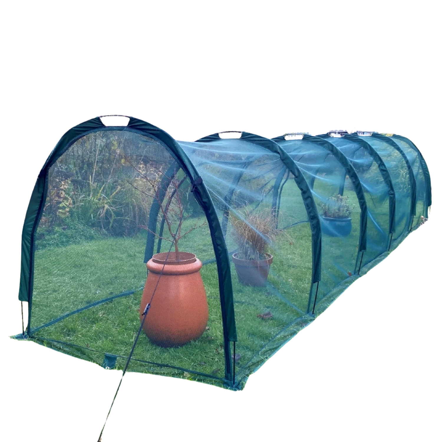 Serre tunnel de jardin de haute qualité pour cultiver et protéger les cultures, les plantes en pot et les fleurs. Ce tunnel de serre est doté d'un filet à mailles fines (diamètre 4 mm) qui protège les fruits et légumes des oiseaux, des insectes, des rongeurs et des intempéries comme le vent et la grêle. Le maillage vert foncé aide également à protéger les cultures contre un soleil excessif et évite que les légumes ne soient brûlés par les rayons UV ! Ce tunnel est très simple et pratique à utiliser. Il est livré dans un petit sac qui peut être stocké dans une serre ou un hangar. Pour l'assemblage, retirez la housse du sac et joignez les piquets flexibles entre eux à l'aide des connecteurs. Insérez les piquets dans les manchons de la couverture puis fixez-les dans le sol avec des chevilles de fixation. Enfin, attachez les cordes à chaque extrémité pour plus de stabilité. Tous les composants pour assembler votre mini serre tunnel sont fournis. Quatre grandes entrées zippées vous permettent d'accéder facilement à vos cultures et aident à réguler la chaleur et l'humidité. Dimensions du tunnel assemblé : 500 cm x 100 cm x 100 cm de hauteur