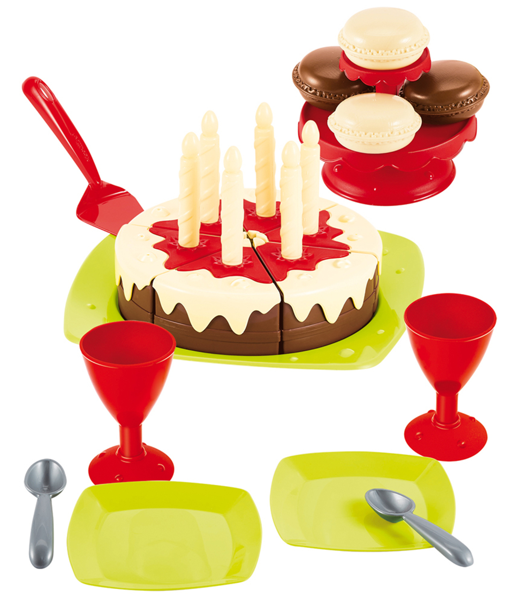 Ce set de fête contient un gâteau de 6 parts avec 6 bougies et son plat de présentation, une pelle à gâteau, un présentoir garni de 4 macarons, 2 verres à pied, 2 assiettes et 2 cuillères pour la dégustation. Origine France Garantie. Conseillé dès 18 mois.