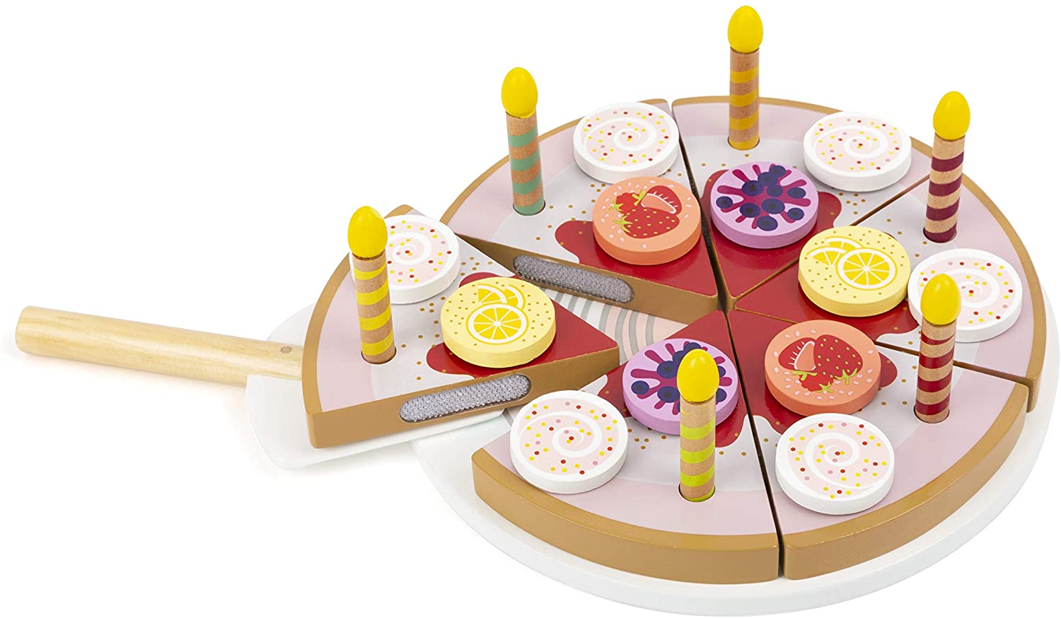 Les morceaux de gâteau sont reliés les uns aux autres par velcro et peuvent être facilement coupés à l'aide d'un couteau et assemblés en un gâteau en un rien de temps.Les petites décorations avec du velcro peuvent être mises selon ses volontés ce qui entraînent les capacités combinatoires.Le gâteau a 6 Bougies amovibles, qui intègre une sorte de jeu à encastrer.Le délicieux gâteau en bois vous invite à un jeu de rôle réaliste qui favorise la fantaisie, la créativité, la reconnaissance des couleurs et bien plus encore.Le complément parfait pour les cuisines d'enfants ou la boutique !