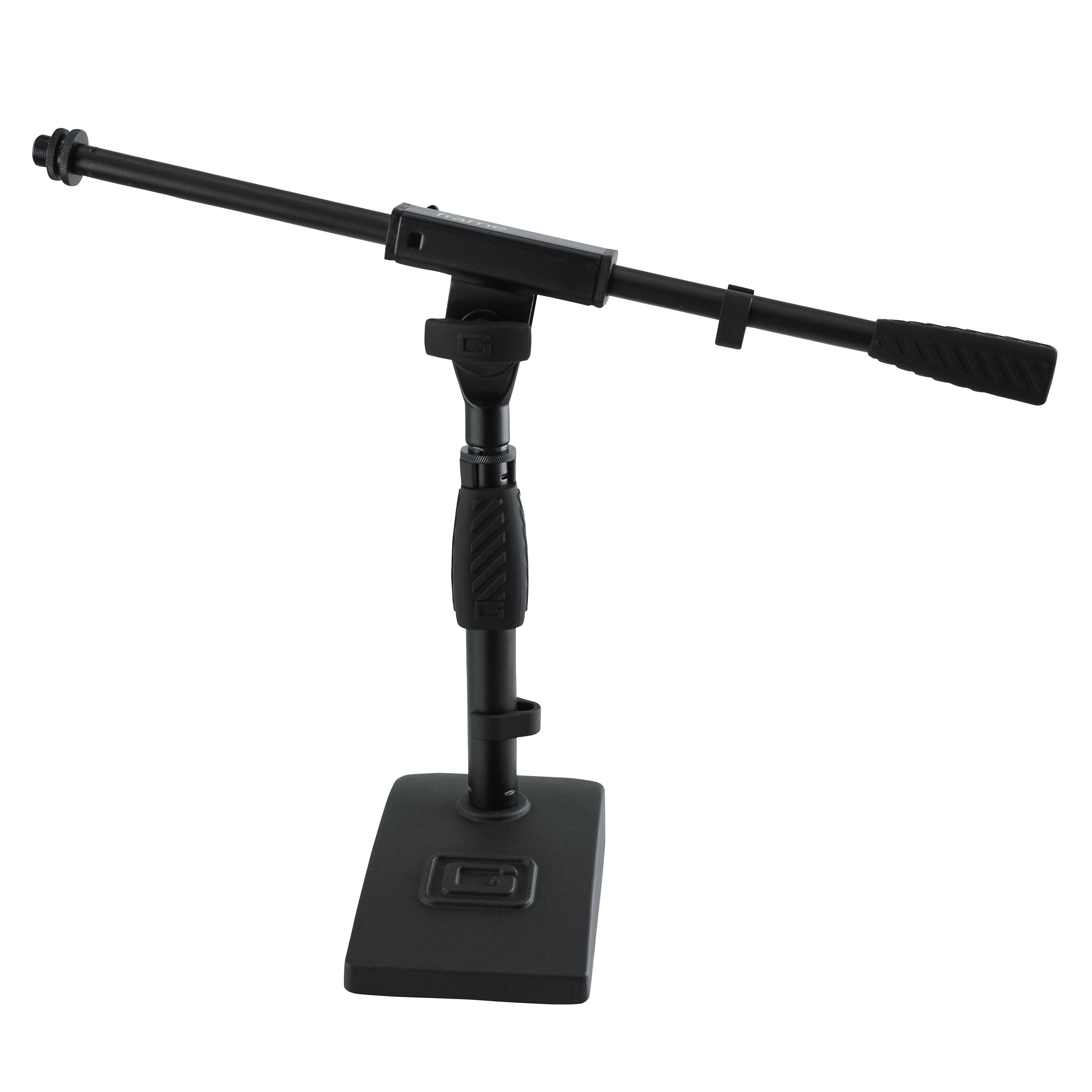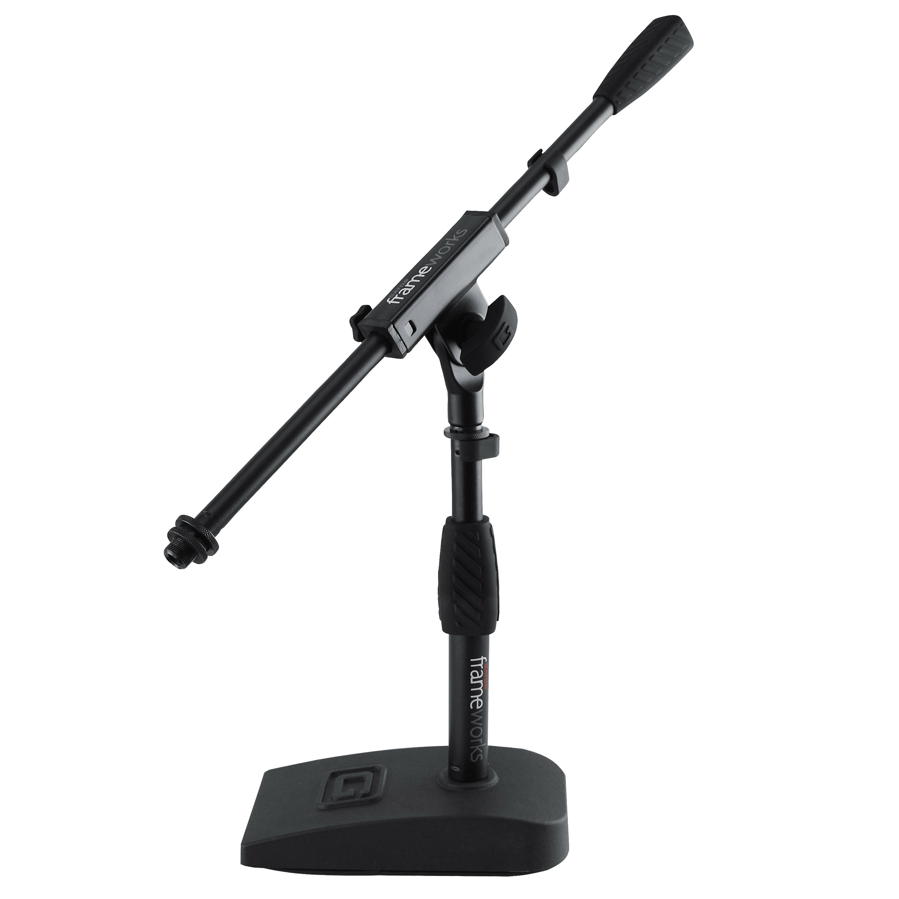 Support court pour micro avec base compacte - longueur max de la perche 406 mm - Base équilibrée et stable - passe-câble inclus - Joint antidérapant inférieur pour réduire les vibrations - Compatible avec les pinces au pas de vis américain et européen