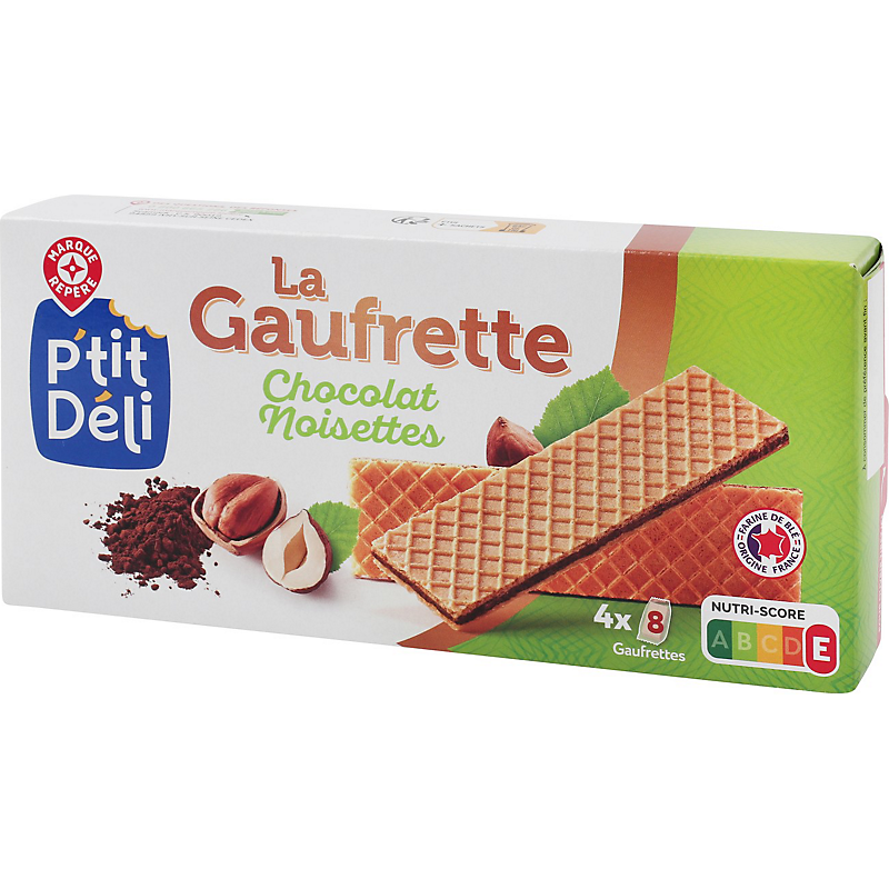 Gaufrettes avec 66,3 % de fourrage au chocolat en poudre et aux noisettes, aromatisées. P'TIT DELI