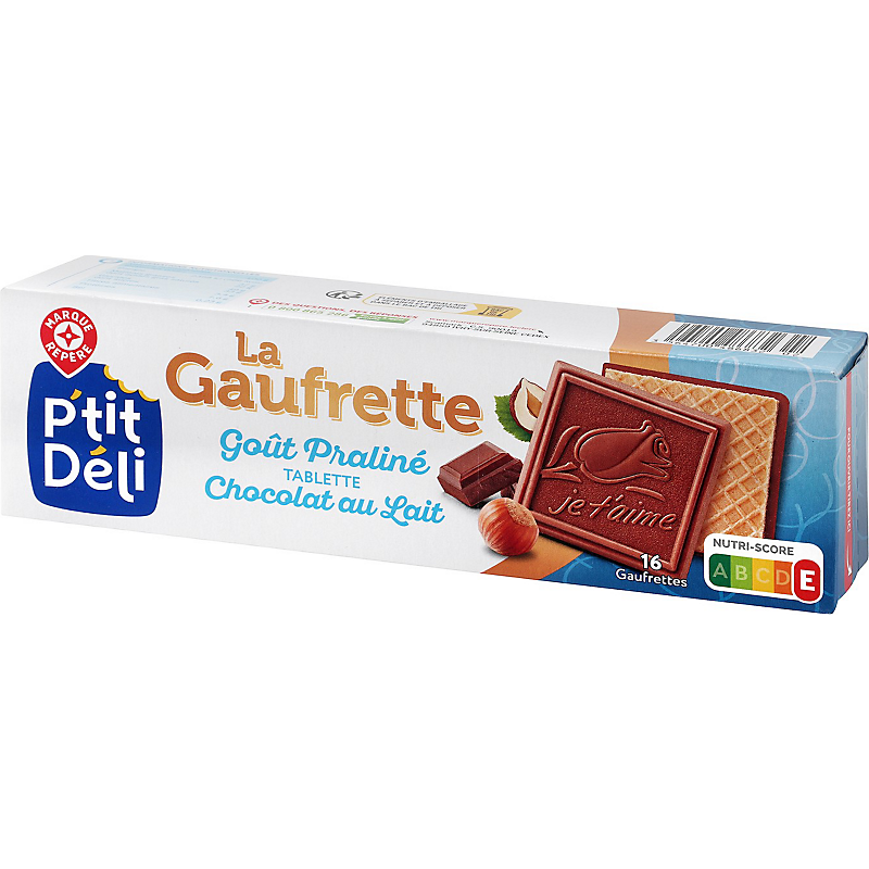 Gaufrettes avec fourrage (35 %) à la noisette et au cacao, recouvertes d’une tablette de chocolat au lait (48%) P'TIT DELI