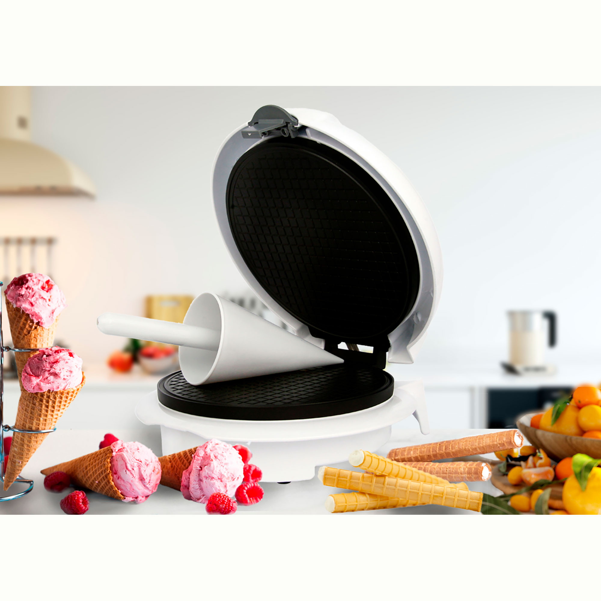 • Gaufrettes à cornets de 18 cm de diamètre : cet appareil permet de cuire une gaufrette de 18 cm de diamètre, comprend un accessoire pour former des cônes que vous pouvez remplir de délicieuses crèmes, glaces, fruits, etc.