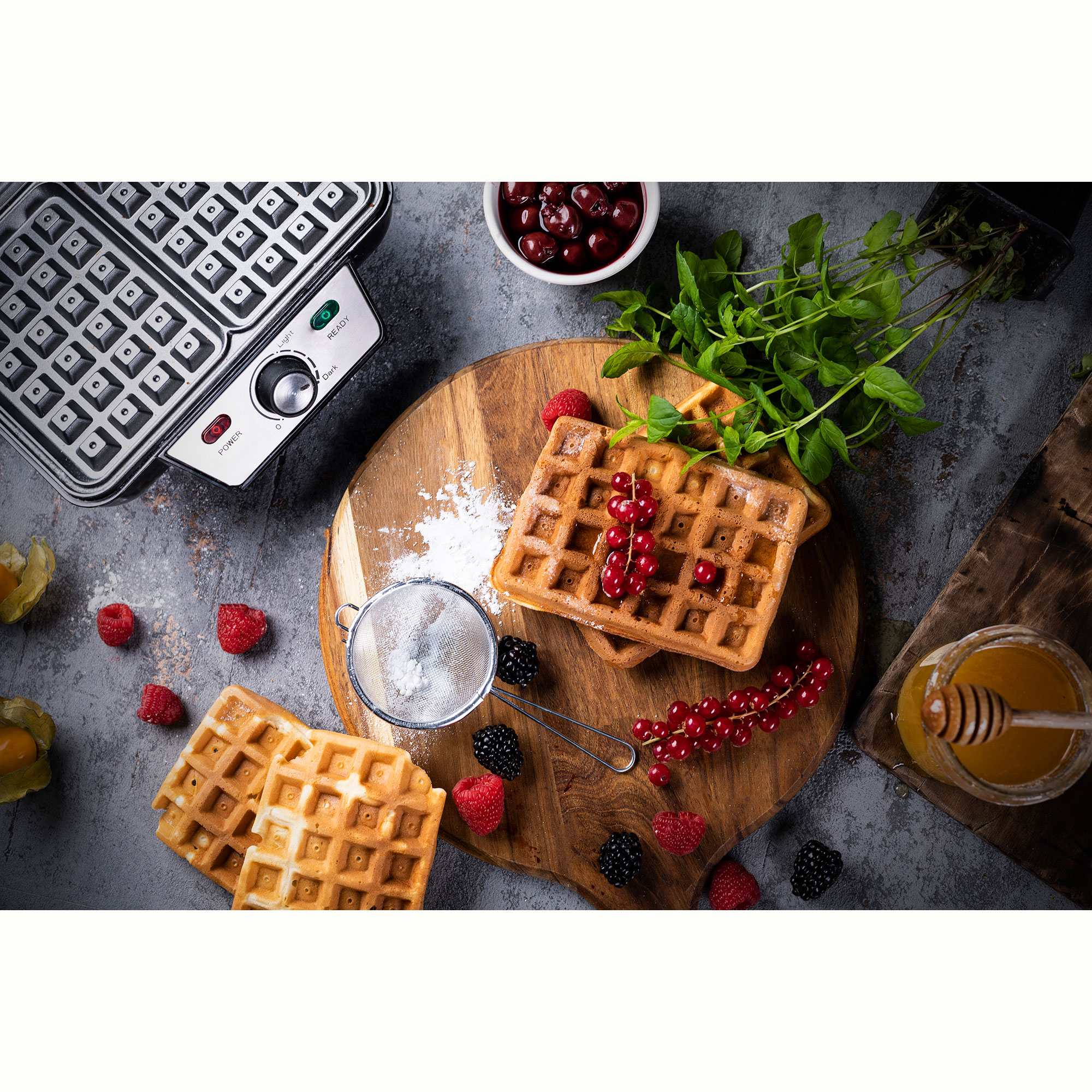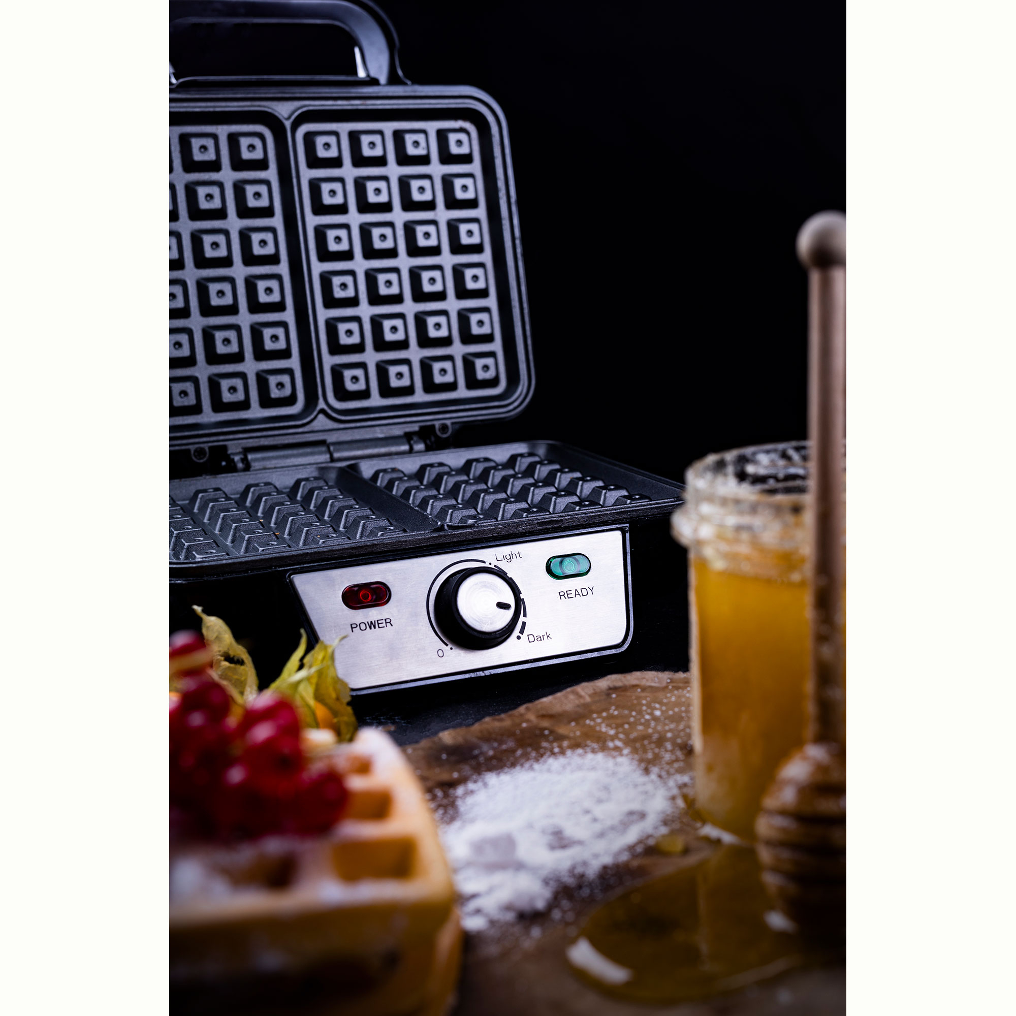 - Le thermostat maintient une température optimale pour la cuisson des gaufres.