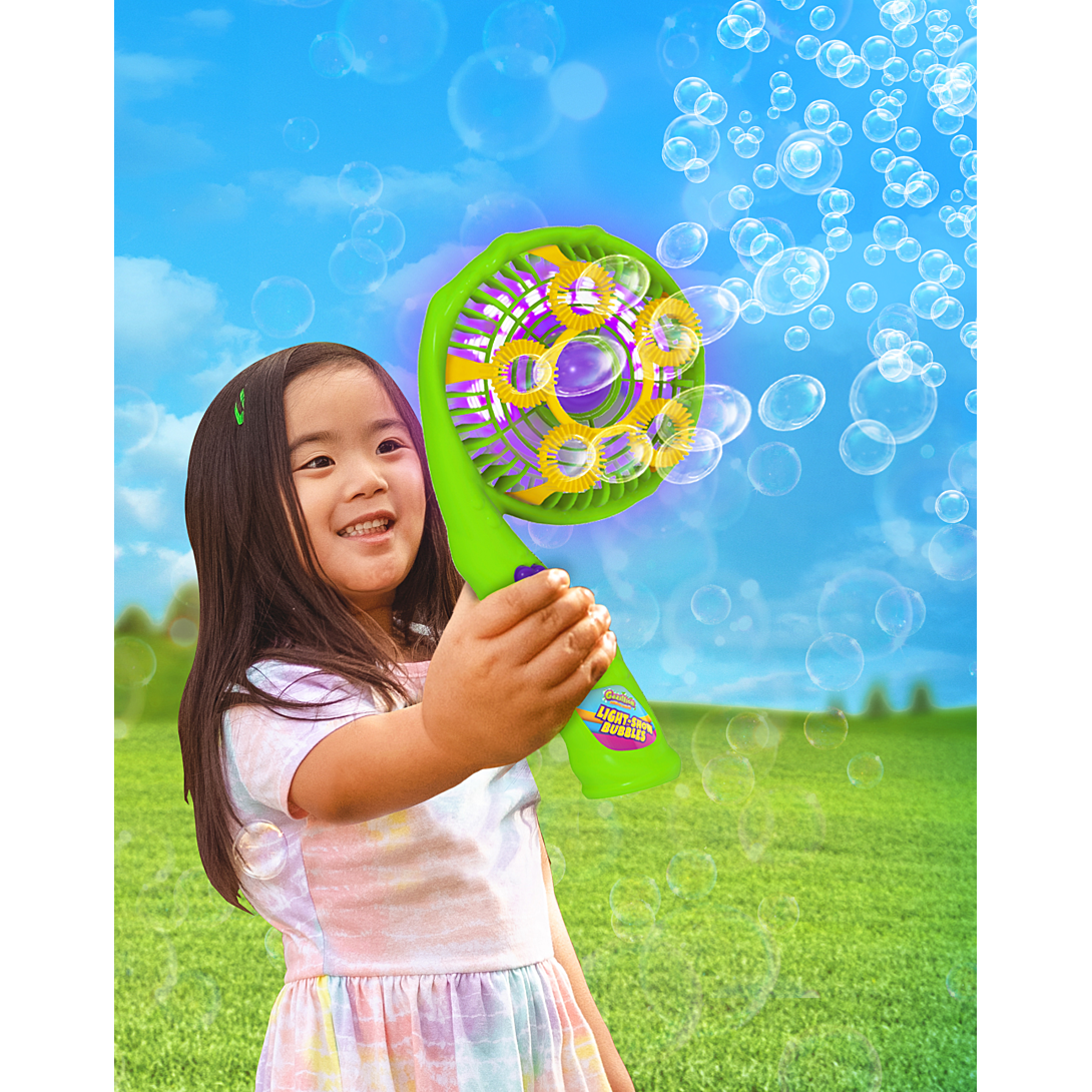 Ventilateur à bulles, appuie sur le bouton pour active la fonction lumière (10 effets lumineux) et voir souffler des tonnes de bulles dans l’air! Comprend 118ml de solution à bulles. Necessite 4 piles LR03. Dimensions: 22 x 8 x 11 cm