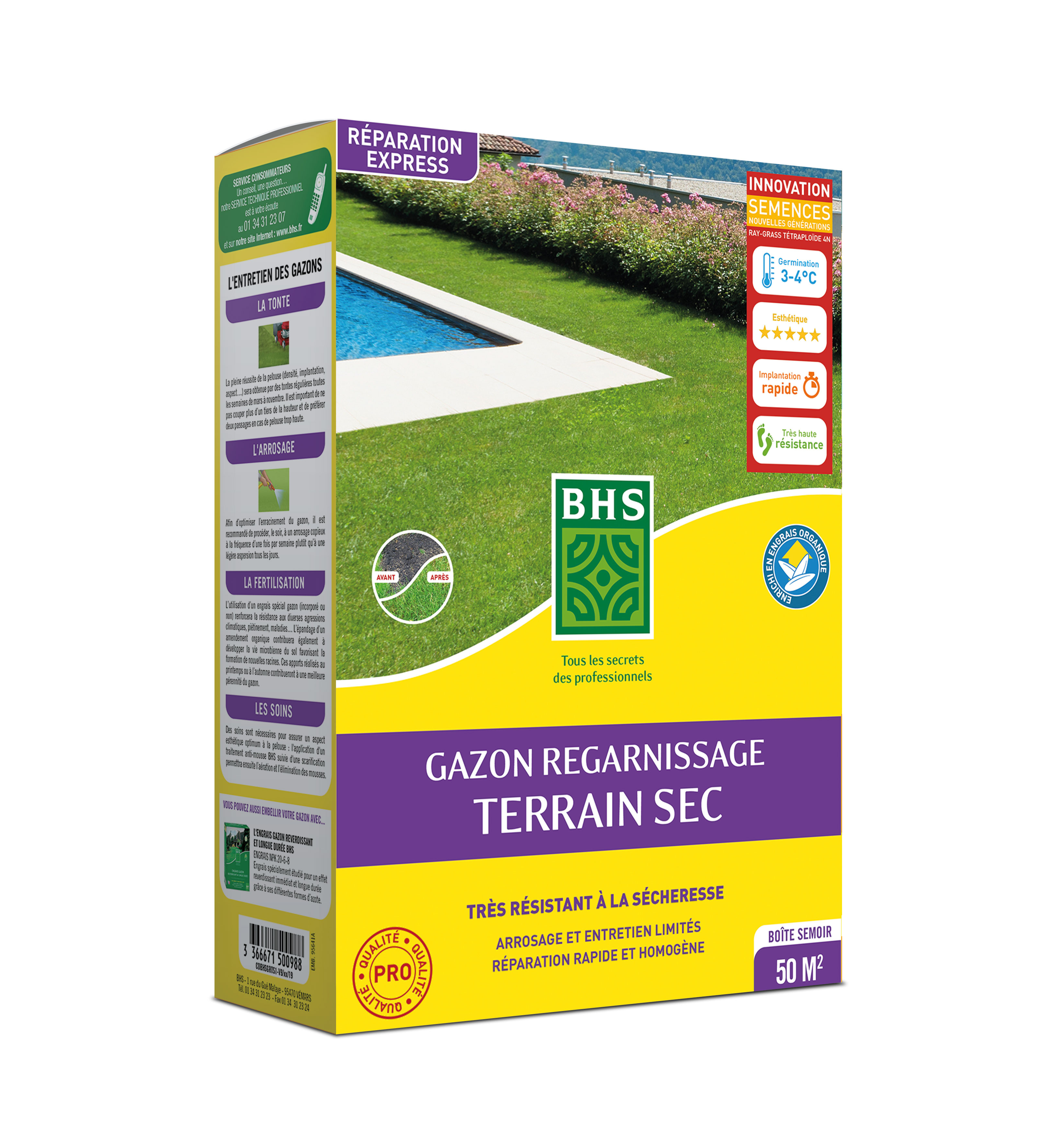 GAZON REGARNISSAGE TERRAIN SEC, avec engrais organique est particulièrement adapté pour le ressemis en localisé des zones dénudées. Ce mélange est vivement conseillé pour les conditions climatiques du sud de la France et les terrains secs, ou orientés plein sud.