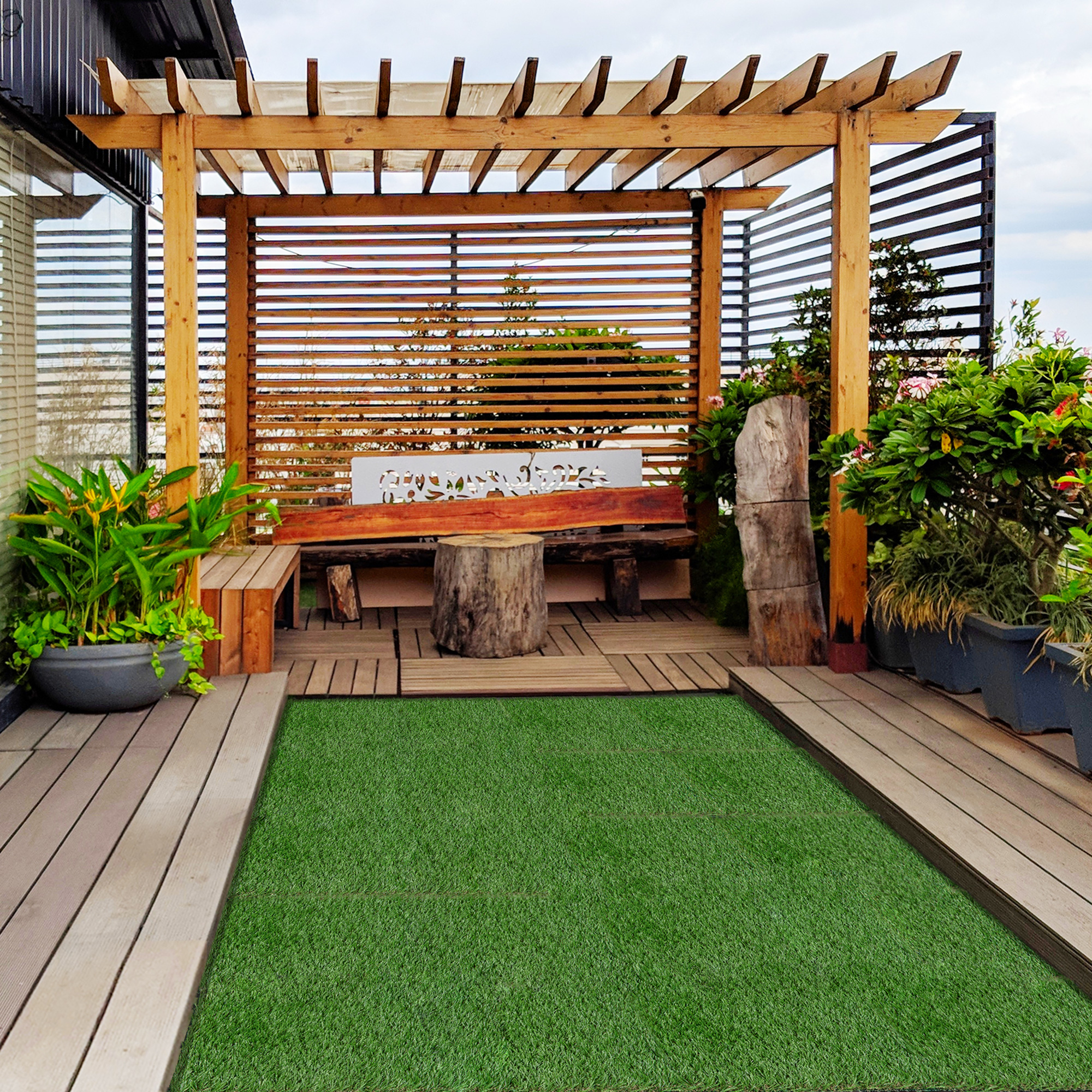 Cette magnifique pelouse artificielle en dalles (lot de 10) dimensions 30 x 30 cm vous permettra de profiter d'un beau gazon sans ses contraintes récurrentes d'entretien. Pouvant être installée sur de la terre, une terrasse ou un balcon, cette pelouse ajoutera une touche de verdure et confort à votre extérieur. En effet, ses 35 mm d'épaisseur lui confère un grand confort pour marcher pied nu ou en chaussettes comme sur un tapis.