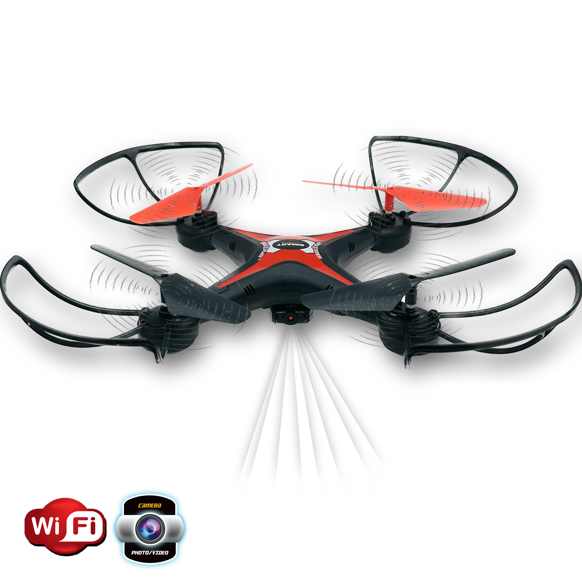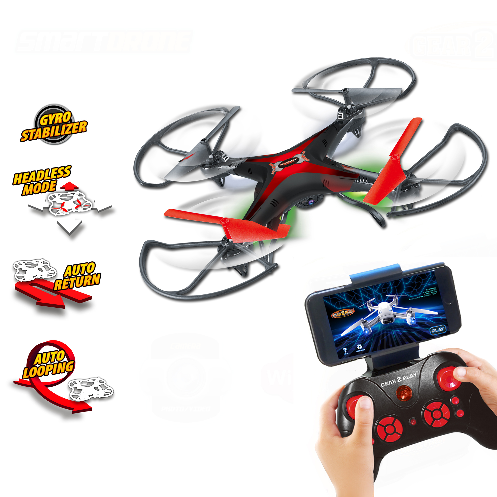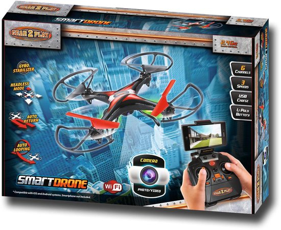 Avec ce drone de 2,4 GHz avec Smart Wifi d´un diamètre de 31,5 cm tu enregistres les vols en temps réelle ,fait des cliches et vidéos. Faites votre propre looping . Avec le mode sans tète vous choisissez toujours la bonne direction. Dispose d´un fonction auto return pour retourner automatiquement au départ.