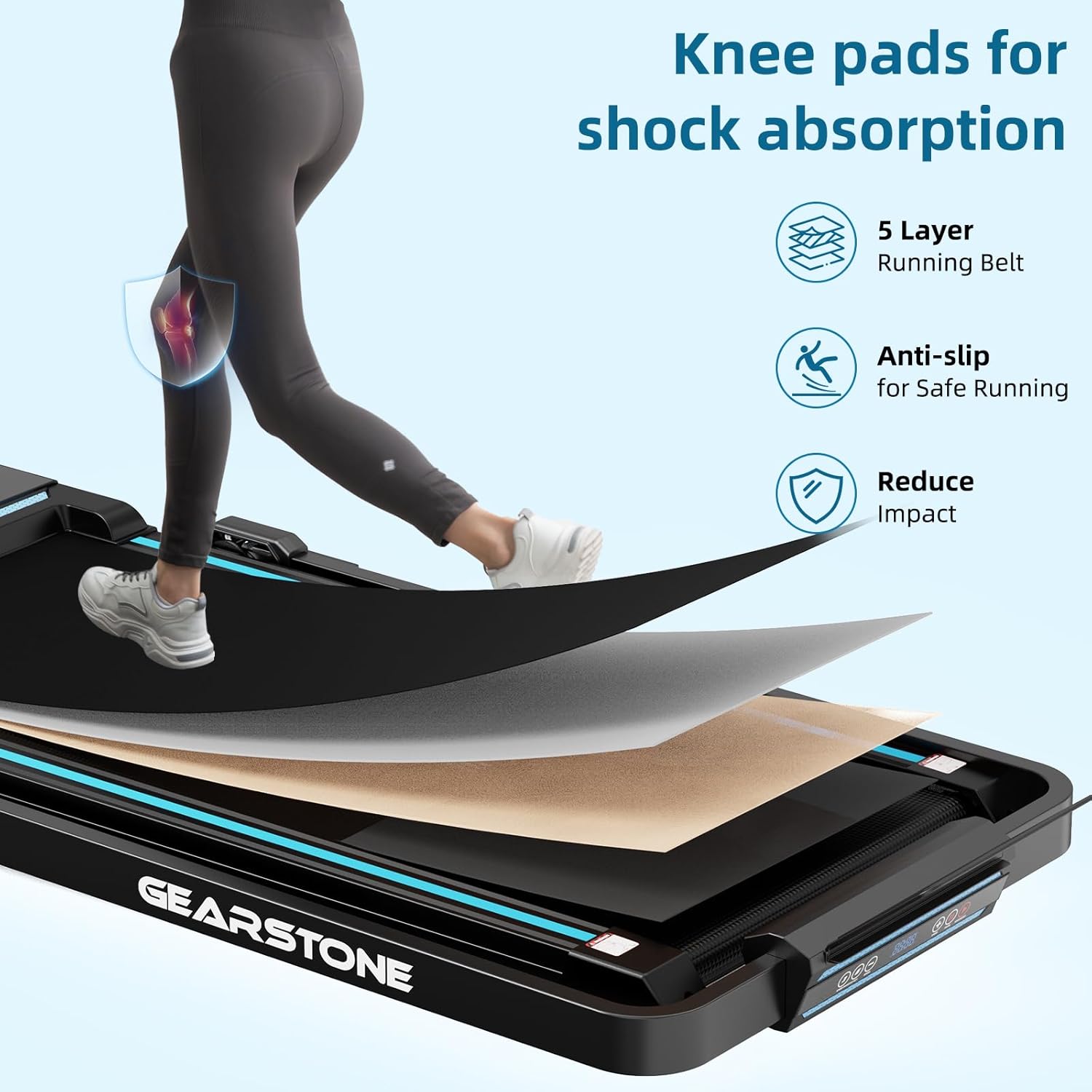 🛋️ Confort Optimal : Surface Amortissante et SécuriséeLe tapis roulant GEARSTONE est conçu pour offrir un confort exceptionnel grâce à sa surface de course de 42 x 95 cm. Sa structure en 5 couches assure un excellent amortissement des chocs, protégeant ainsi vos articulations pendant l’entraînement. L’intérieur antidérapant et imperméable garantit une stabilité et une sécurité maximales pendant l’utilisation. Avec une capacité de charge de 120 kg, ce tapis est robuste et fiable pour tous les utilisateurs.