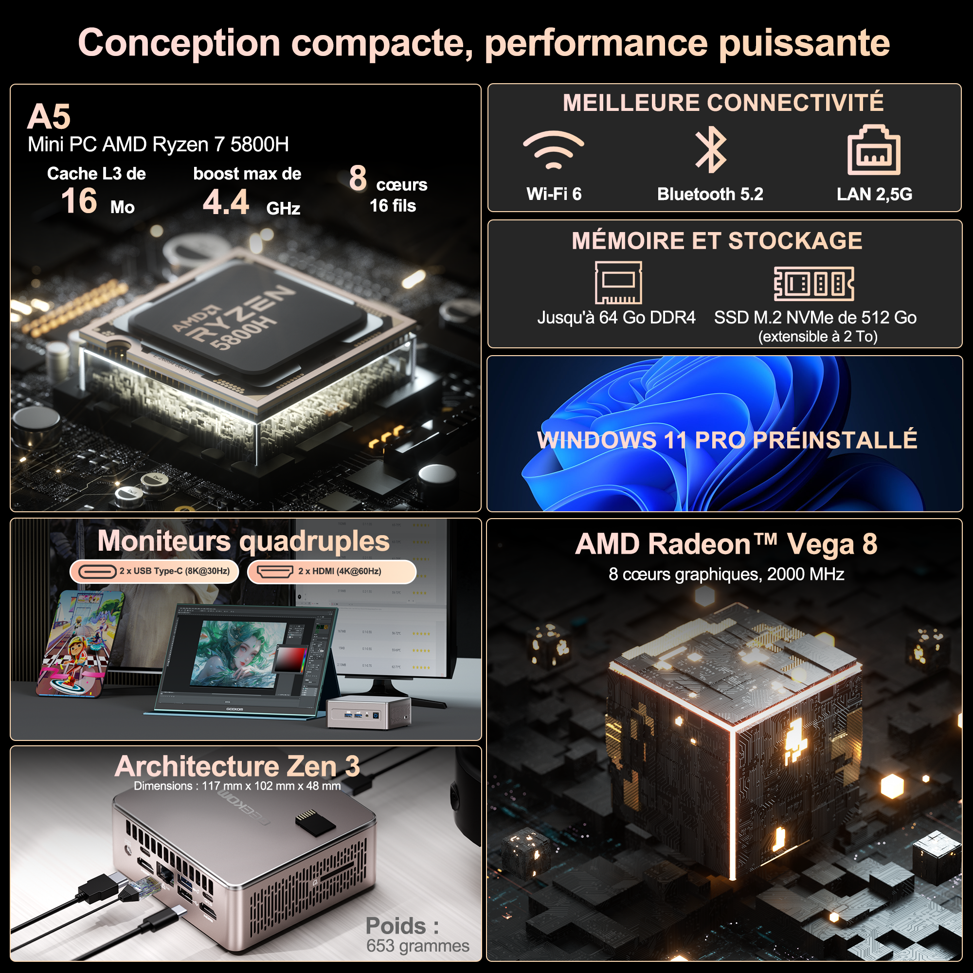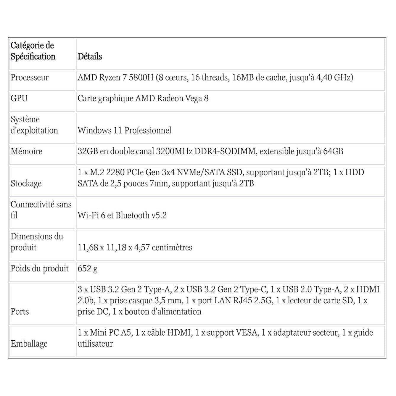 | Libellé | GEEKOM A5 – Mini PC avec AMD Ryzen 7 5800H, 32GB RAM, 512GB SSD, Ordinateur de Bureau Compact, Windows 11 Pro, NUC Polyvalent |