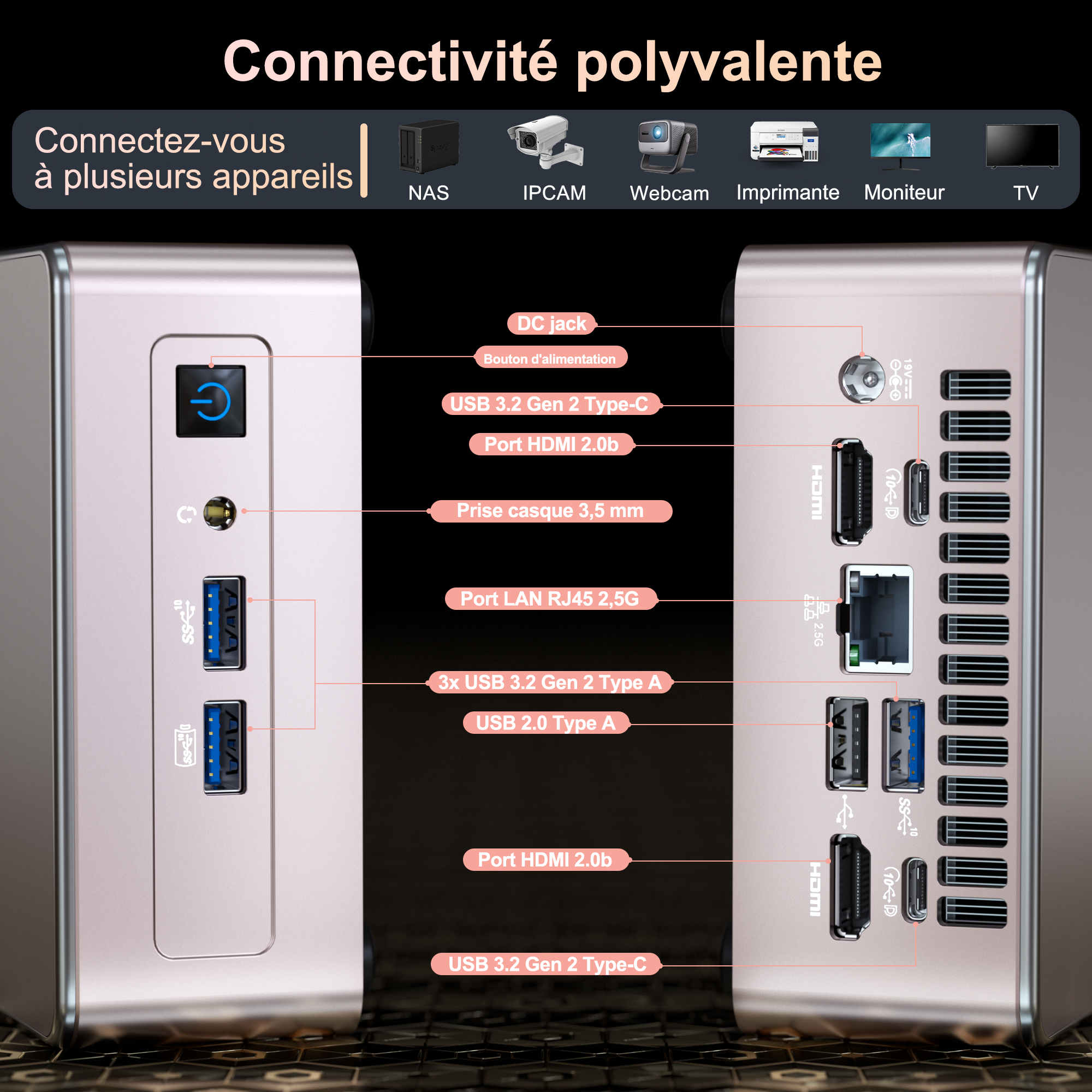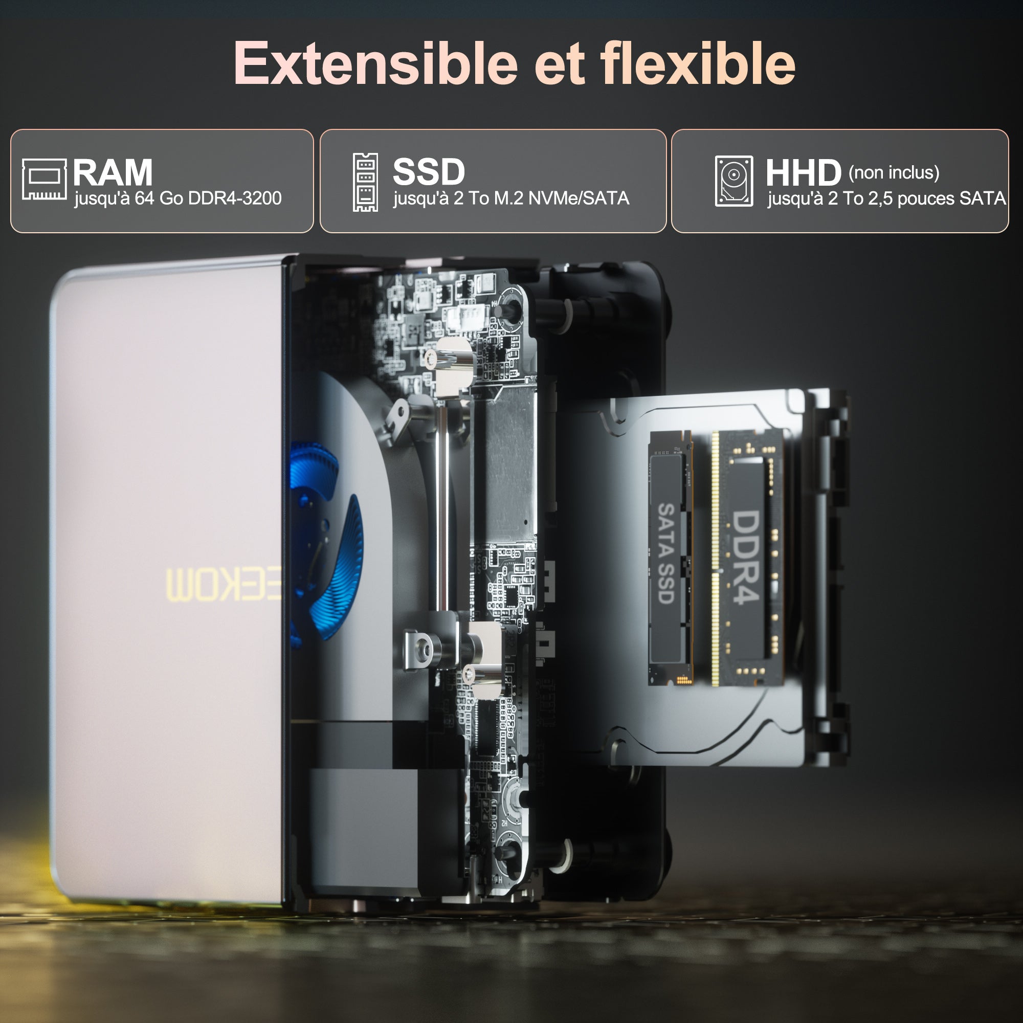 - Mémoire: 32GB RAM DDR4, extensible pour des tâches multitâches fluides.