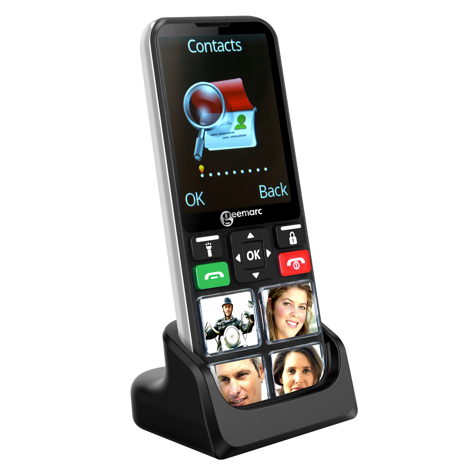 Téléphone Portable de la marque Geemarc. Interface et utilisation simplifiée conçu pour les seniors. Compatible avec les appareils auditifs M4/T4, ce qui améliore la qualité sonore pour les utilisateurs malentendants. Fonction d'appel d'urgence avec un bouton SOS permettant de contacter jusqu'à cinq numéros programmés, incluant la géolocalisation automatique. Doté de quatre touches mémoire directes avec photos. Larges touches avec rétro-éclairage blanc et fort contraste. Design ergonomique.