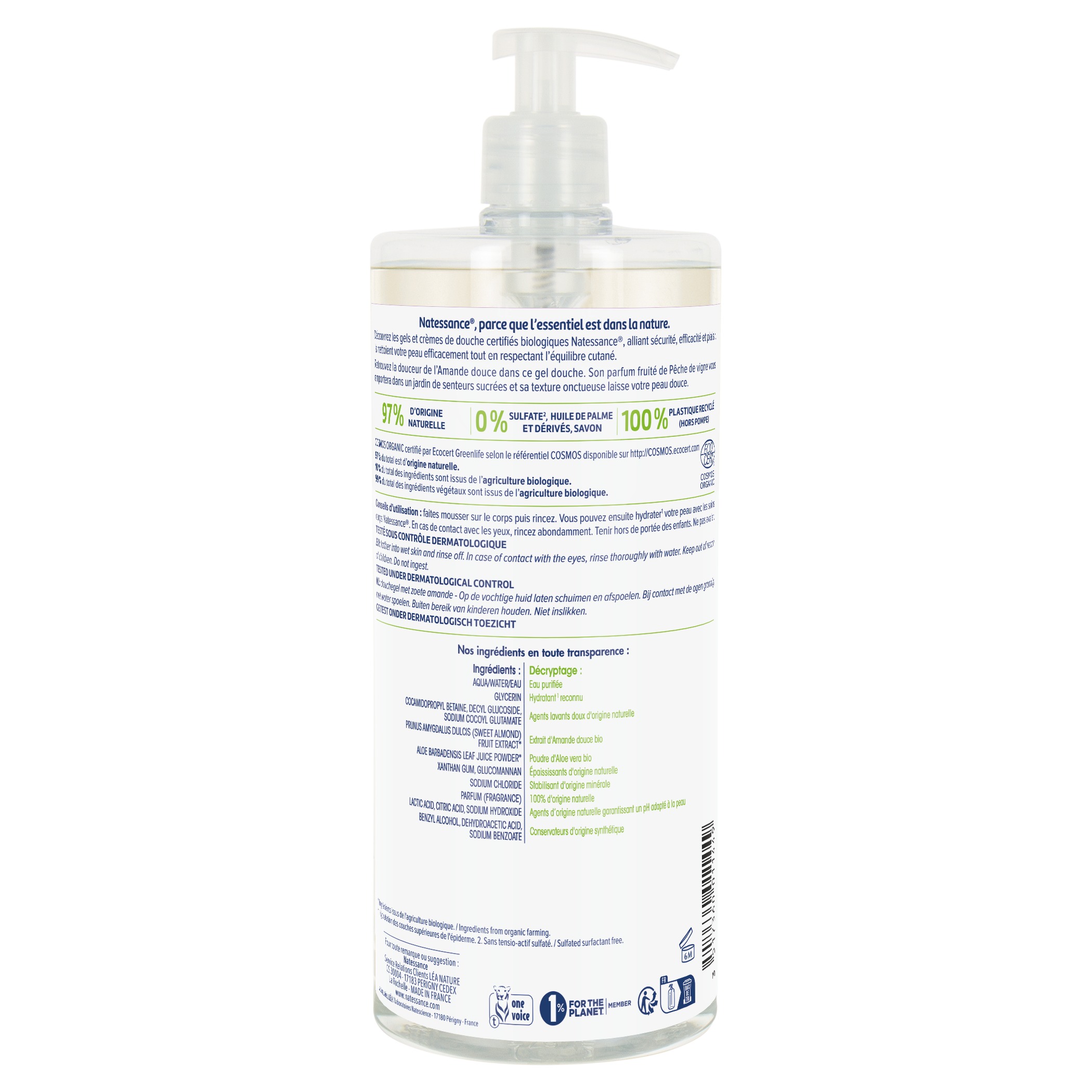 Natessance Gel Douche Amande 1 L avec base lavante douce issue de la noix de coco, formulé sans sulfates, , sans savon et d'origine 100% végétale, nettoie la peau en douceur et efficacement, tout en la respectant. Le délicieux parfum de pêche de vigne de ce gel douche vous offre une véritable expérience sensorielle. Ce gel douche à la texture gélifiée et au pH physiologique vous apportera une parenthèse de bien-être et une sensation d'évasion.