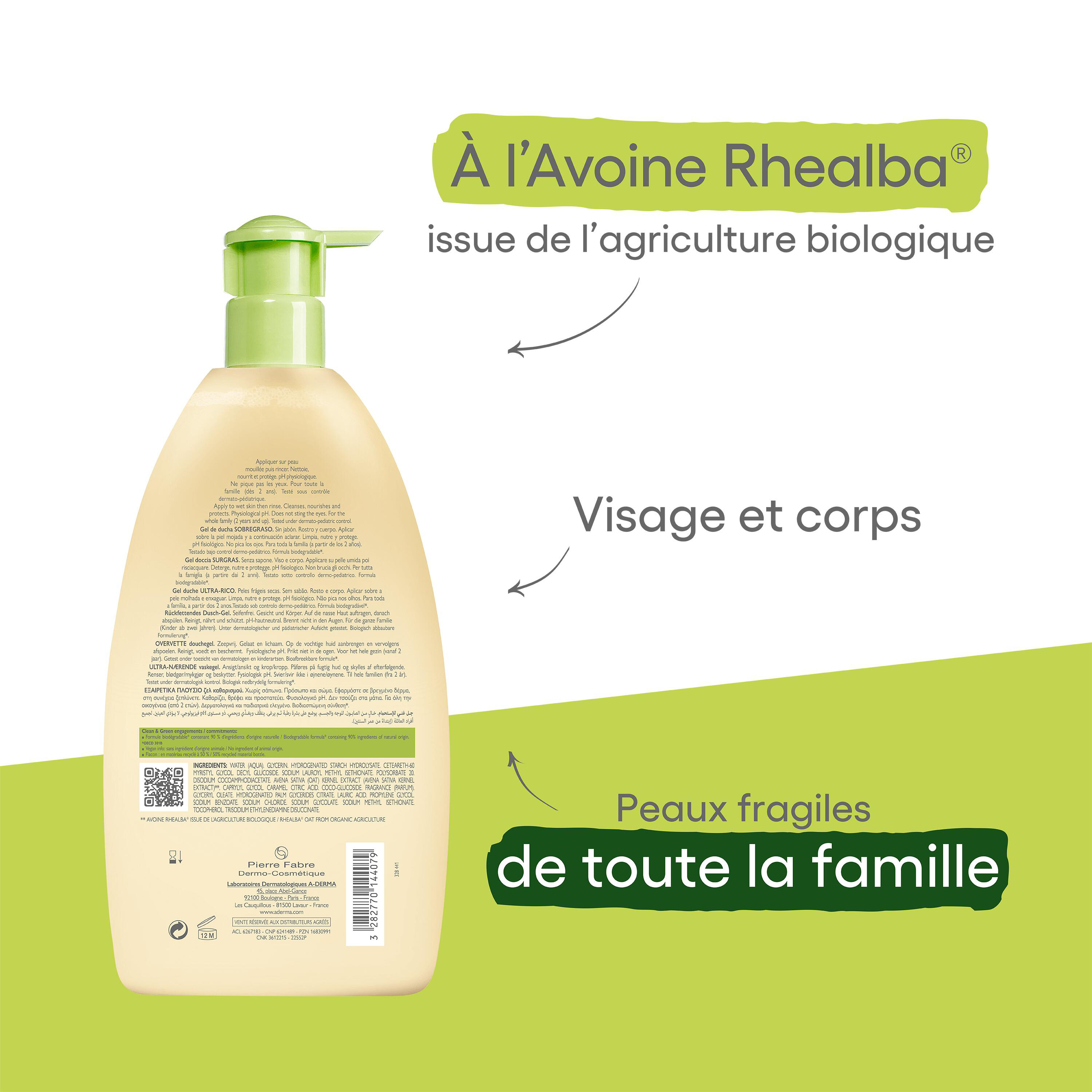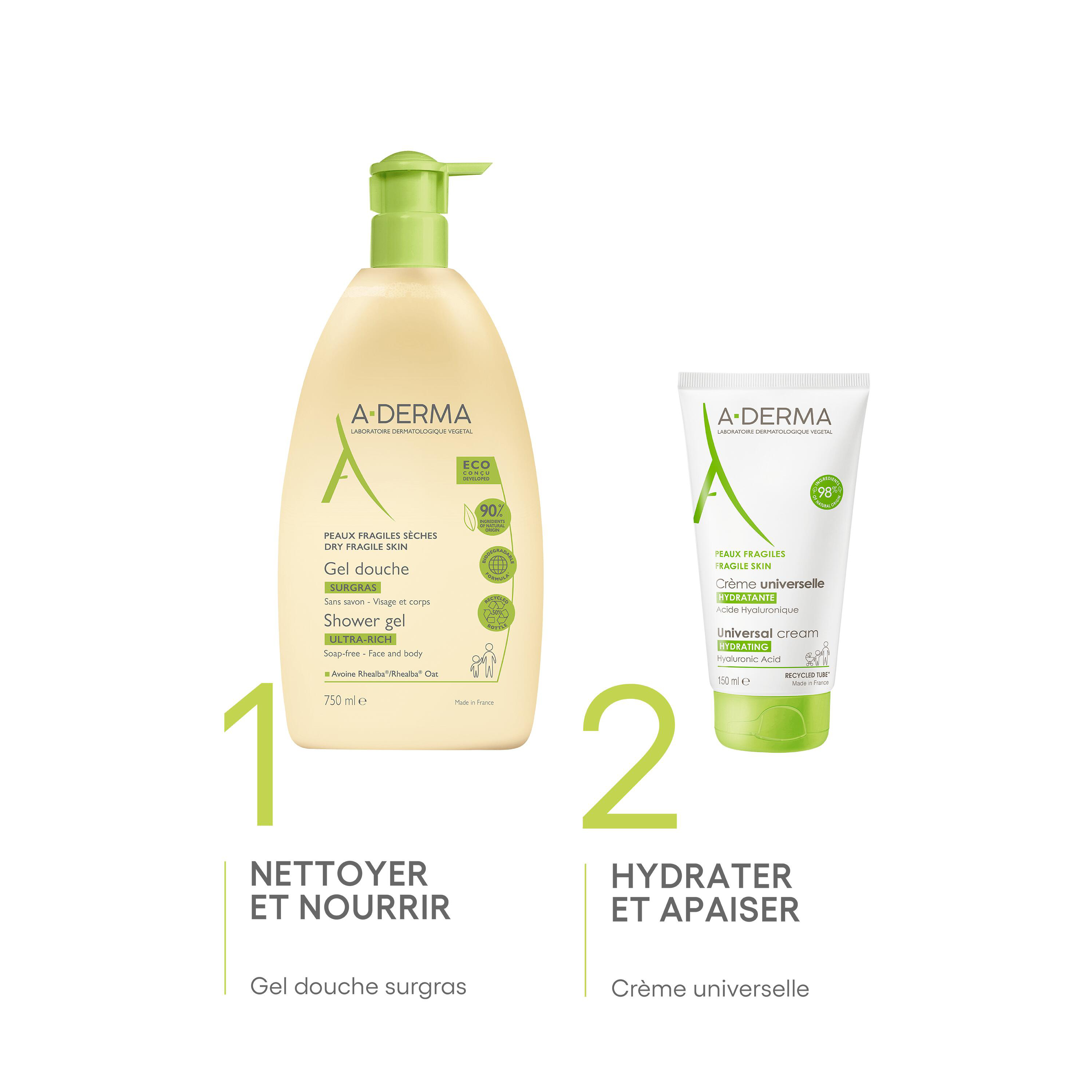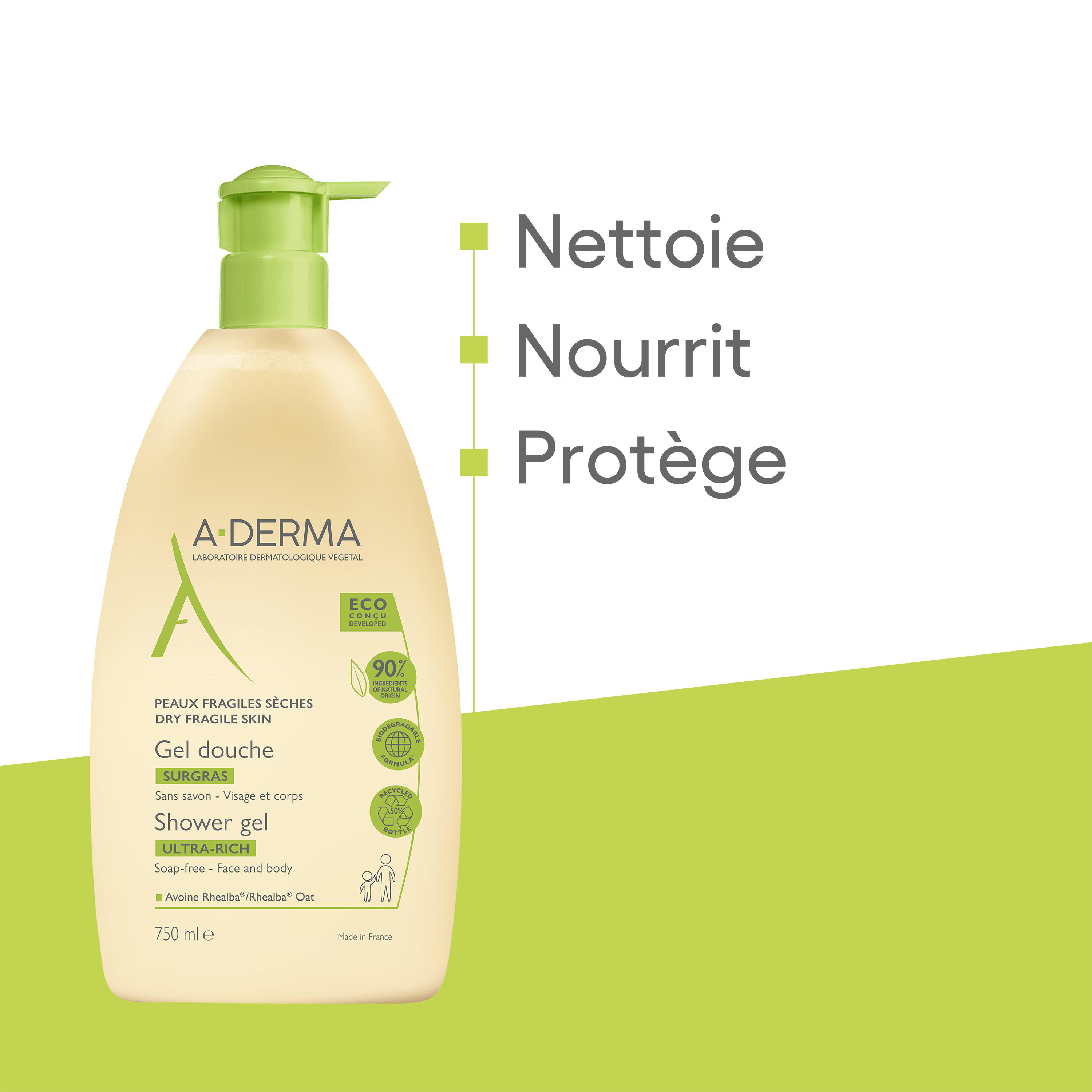 Expert de l’hygiène des peaux fragiles, le Laboratoire dermatologique végétal A-DERMA répond au besoin des peaux sèches avec ce gel douche. Ce soin lavant composé à 90% d'ingrédients d'origine naturelle** nettoie en douceur, nourrit et protège. Enrichi en émollients d'origine naturelle, il tire son efficacité et ses vertus apaisantes et relipidantes de l’innovation Clean Care Complex™. Cette association comprend une base lavante douce et un agent compensateur, pour nettoyer sans agresser ni dessécher. Sa formule fondante, à l’extrait de Plantules d’Avoine Rhealba® apaisante adoucit la peau. Biodégradable*, sans savon, le Gel douche surgras est adapté à toute la famille et s’applique sur le visage et le corps. Sous la douche, il se transforme en une mousse aérienne, au parfum léger, qui se rince facilement. La peau sèche est nourrie***, apaisée**** et protégée. Avoine Rhealba® issue de l’agriculture biologique. Flacon contenant 50% de plastique recyclé. Info Vegan : sans ingrédient d'origine animale. * Selon la norme OCDE 301B ** Contient 90% d'ingrédients d'origine naturelle *** La peau est nourrie pour 97% des sujets. **** La peau est apaisée pour 100% des sujets. Résultat obtenu après étude de la tolérance à l’usage enfants et efficacité (33 sujets) • NETTOIE : base lavante aux tensio-actifs ultra-doux pour nettoyer en respectant les peaux fragiles tout en neutralisant l’eau calcaire. • NOURRIT : l'agent surgras présent prend soin de la peau et la laisse douce et nourrie*** pour la journée. • PROTÈGE : son agent émollient compensateur renforce la barrière cutanée et dépose un film protecteur sur l’épiderme. *** La peau est nourrie pour 97% des sujets — Résultat obtenu après étude de la tolérance à l’usage enfants et efficacité — 33 sujets. Ce gel douche surgras pour les peaux fragiles sèches nettoie en douceur, protège et nourrit. Son Green Impact Index est A, on vous explique pourquoi. Le Green Impact index mesure l'impact environnemental et sociétal de nos produits à partir d'une note globale intégrant 20 critères. Le Green Impact Index ne mesure pas l’efficacité du produit, ni ses effets sur la santé de chacun, mais son respect de la nature et de la société dans son ensemble (éco-socio-conception). Chez Pierre Fabre, on estime qu’un produit commence à être éco-socio-conçu à partir d'une note B, même si l’objectif est à terme d’atteindre A. L’impact environnemental et sociétal de ce produit est : Emballage comportant au moins 39% de matières recyclées Packaging contenant des matériaux majoritairement recyclables Emballage bénéficiant d'une prime en raison de l'incorporation de plastique recyclé Formule biodégradable** 88% d’ingrédients d’origine naturelle***** **Selon le test OCDE 301B *****Hors gaz Fabriqué dans une usine certifiée pour l’environnement*** Plante issue de l’agriculture biologique ***Selon la norme ISO 14001 ou ECOVADIS