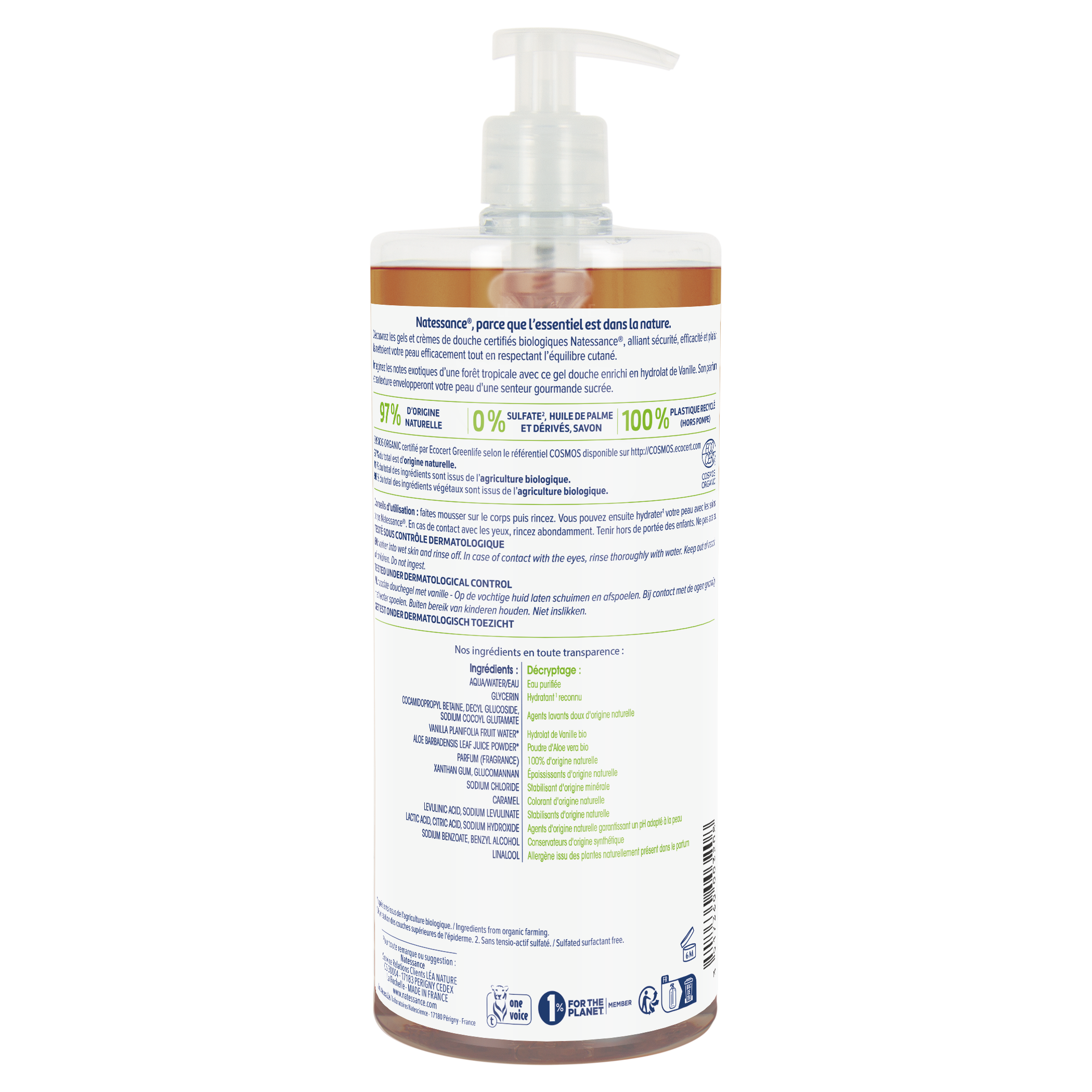 Aqua (Water), Cocamidopropyl Betaine, Coco-Glucoside, Decyl Glucoside, Lactic Acid, Sodium Cocoyl Glutamate, Disodium Lauryl Sulfosuccinate, Sodium Chloride, Glycerin, Sodium Benzoate, Parfum (Fragrance), Vanilla Planifolia Fruit Water*, Glyceryl Laurate, Aloe Barbadensis Leaf Juice Powder*, Caramel, Sodium Hydroxide, Linalool, Sodium Levulinate. * ingrédients issus de l'agriculture biologique.