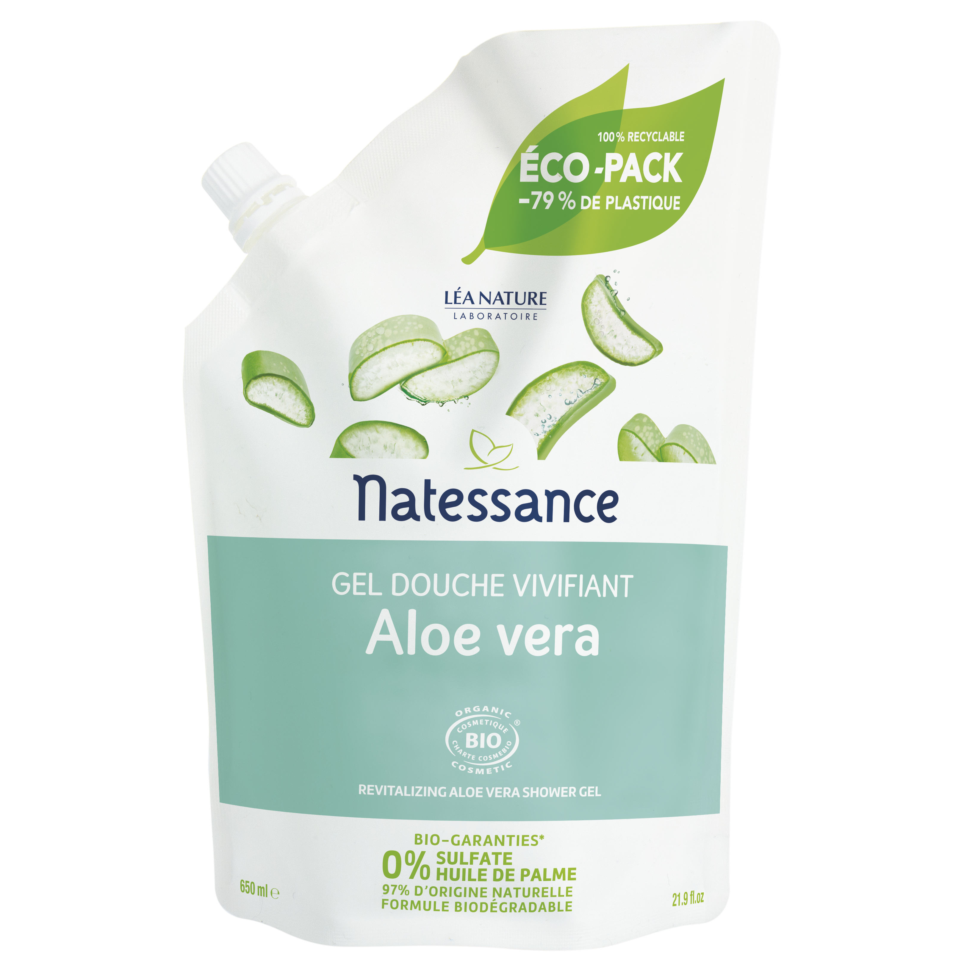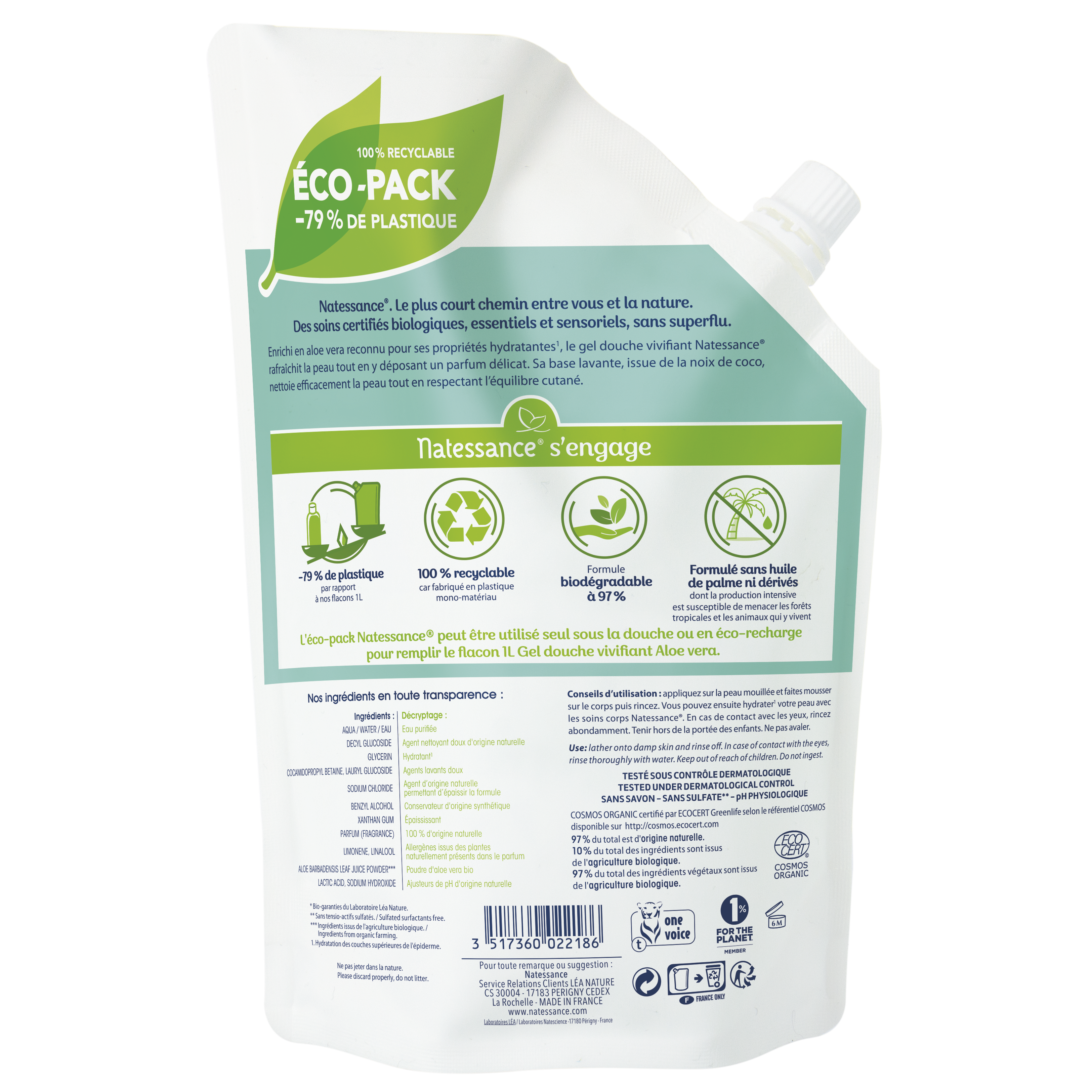Natessance®, le plus court chemin entre vous et la Nature. Des soins certifiés biologiques, essentiels et sensoriels, sans superflu. L'eco-pack Natessance® peut être utiliser seul sous la douche en en éco-recharge pour remplir le flacon 1L Gel douche vivifiant Aloe vera. Natessance s'engage avec les éco-packs: - 79% de plastique versus à nos flacon 1L - 100% recyclable car fabriqué en plastique mono-matériau - Formule biodégradable à 97% - Sans huile de palme ni dérivés dont la production intensive est susceptible de menacer les forêts tropicales et les animaux qui y vivent
