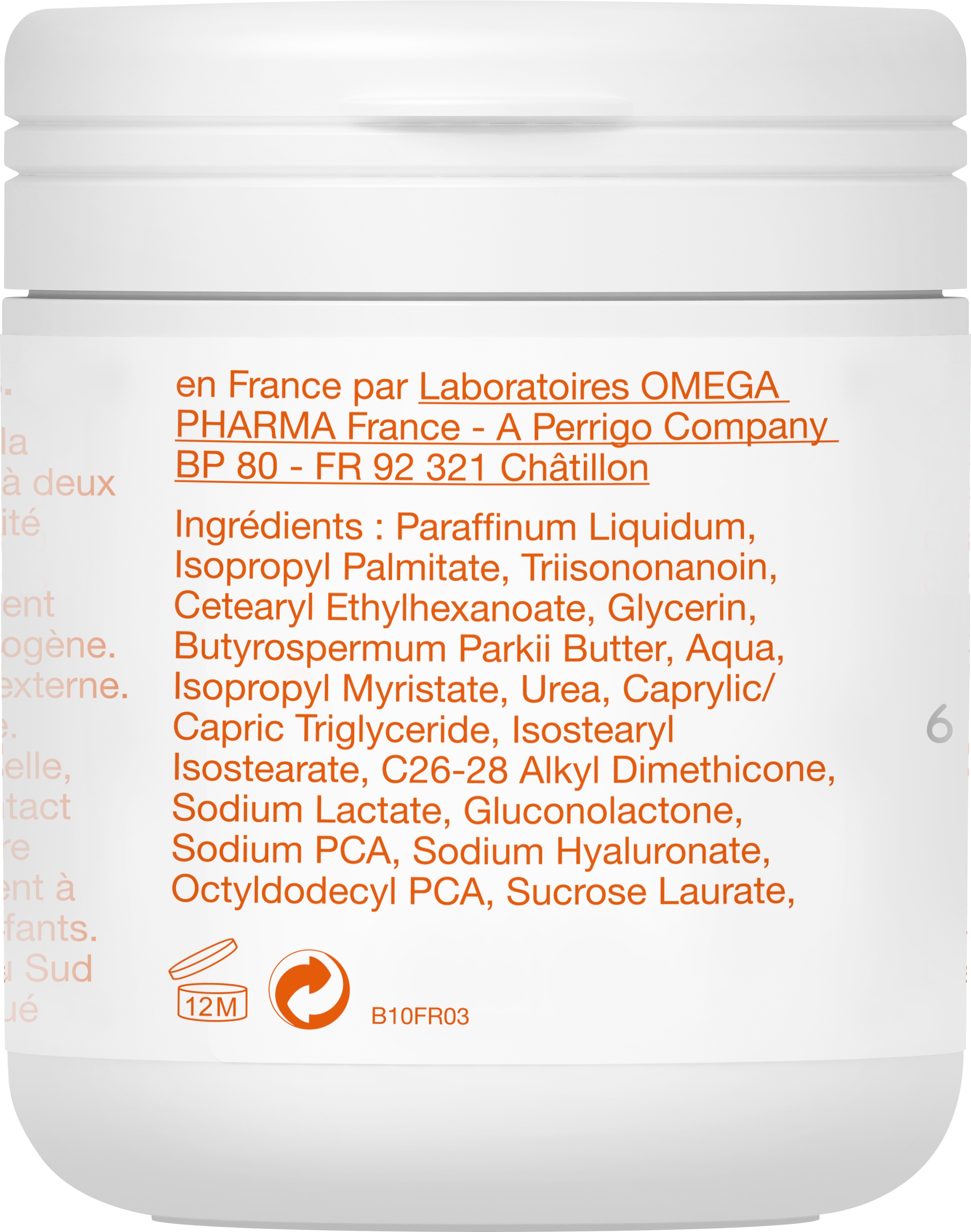 Ingrédients : Paraffinum Liquidum, Isopropyl Palmitate, Triisononanoin, Cetearyl Ethylhexanoate, Glycerin, Butyrospermum Parkii Butter, Aqua, Isopropyl Myristate, Urea, Caprylic/Capric Triglyceride, Isostearyl Isostearate, C26-28 Alkyl Dimethicone, Sodium Lactate, Gluconolactone, Sodium PCA, Sodium Hyaluronate, Octyldodecyl PCA, Sucrose Laurate, Sucrose Stearate, Lactic Acid, Lanolin, Butylene Glycol, Dimethicone/Vinyl Dimethicone Crosspolymer, Bisabolol, Helianthus Annuus Seed Oil, Silica, Glycine Soja Oil, BHT, Retinyl Palmitate, Tocopheryl Acetate, Niacinamide, Linoleic Acid, Linolenic Acid, Tocopherol, Anthemis Nobilis Flower Oil, Calendula Officinalis Extract, Rosmarinus Officinalis Leaf Oil, Lavandula Angustifolia Oil, Parfum, Citronellol, Farnesol, Limonene, Linalool, CI 17200