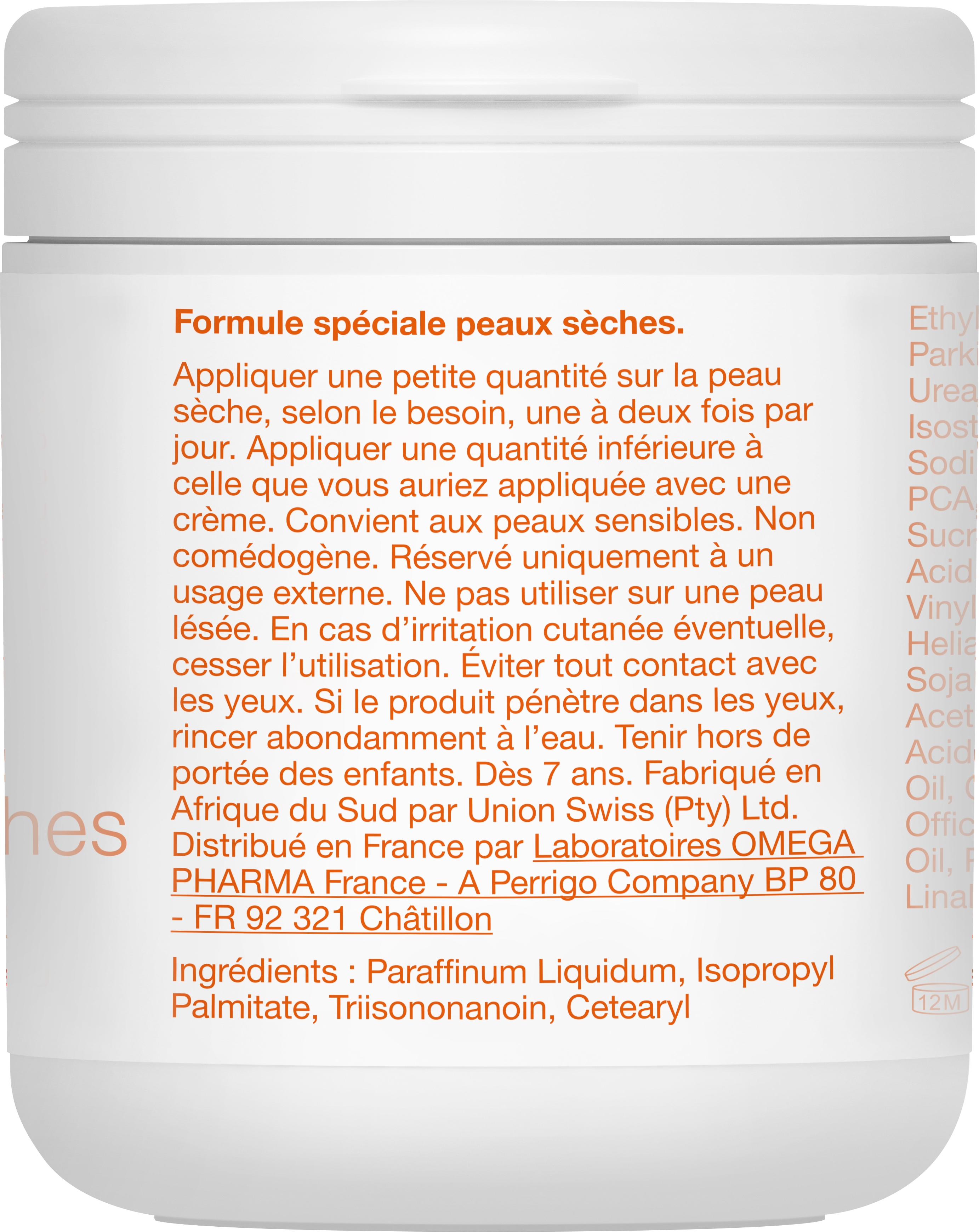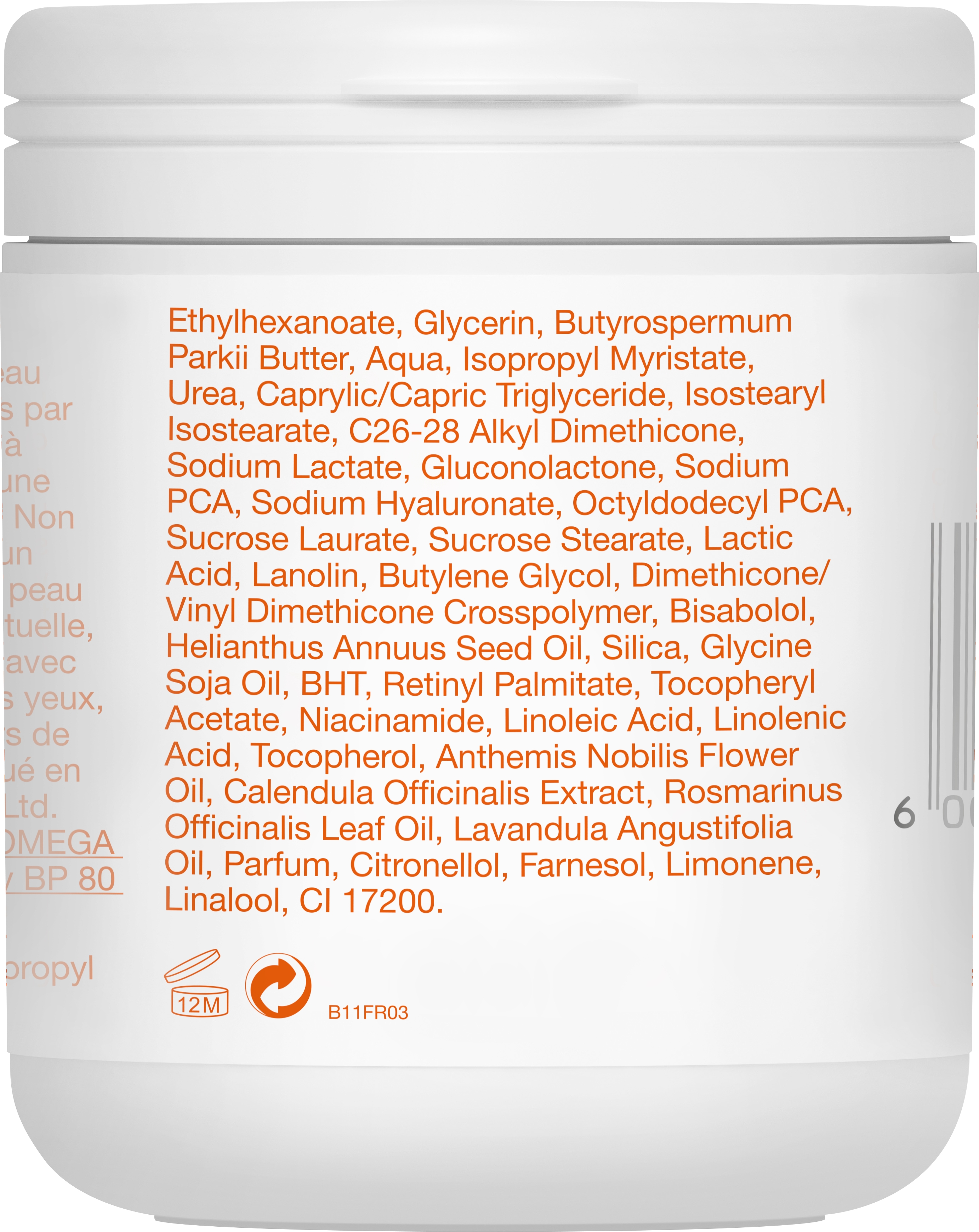 Ingrédients: Paraffinum Liquidum, Isopropyl Palmitate, Triisononanoin, Cetearyl Ethylhexanoate, Glycerin, Butyrospermum Parkii Butter, Aqua, Isopropyl Myristate, Urea, Caprylic/Capric Triglyceride, Isostearyl Isostearate, C26-28 Alkyl Dimethicone, Sodium Lactate, Gluconolactone, Sodium PCA, Sodium Hyaluronate, Octyldodecyl PCA, Sucrose Laurate, Sucrose Stearate, Lactic Acid, Lanolin, Butylene Glycol, Dimethicone/Vinyl Dimethicone Crosspolymer, Bisabolol, Helianthus Annuus Seed Oil, Silica, Glycine Soja Oil, BHT, Retinyl Palmitate, Tocopheryl Acetate, Niacinamide, Linoleic Acid, Linolenic Acid, Tocopherol, Anthemis Nobilis Flower Oil, Calendula Officinalis Extract, Rosmarinus Officinalis Leaf Oil, Lavandula Angustifolia Oil, Parfum, Farnesol, Limonene, Linalool, CI 17200.