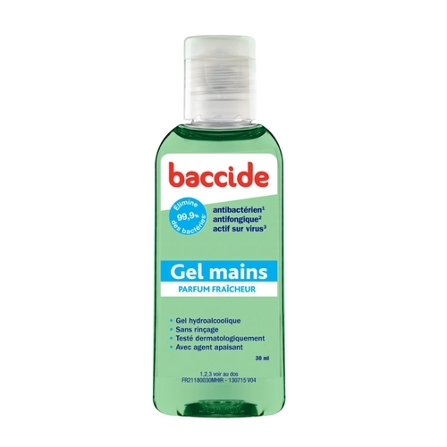 Le Baccide gel mains 30ml vert est antibactérien(1), antifongique(2) et actif sur virus(3). Formule issue du milieu hospitalier active dès 30 secondes, le Baccide Gel 30ml mains est une solution idéale pour l'hygiène de vos mains. Baccide s'utilise sans eau, sans serviette et sèche tout seul. Pratique et facile à utiliser, Baccide vous aide à garder des mains saines à tout moment (activités professionnelles, périodes d'épidémies...). (1) NF EN 1040 (30s), NF EN 1276 (30s), NF EN 13727 (30s), NF EN 1500 (30s) (2) NF EN 1275 (30s), NF EN 1650 (30s), NF EN 13624 (30s) (3) NF EN 14476 (2013, 30s) sur Adenovirus type 5 et Norovirus murin (virus de la gastro-entérite), NF EN 14476+A1 (2007, 30s) sur Rotavirus, Influenza virus [H1N1] et [H5N1] (virus de la grippe A et de la grippe aviaire), Herpès virus type 1, PRV et BVDV (virus modèles des hépatites B et C), VRS, HIV-1, Coronavirus bovin (virus modèle du SRAS) Utilisez les biocides avec précaution. Avant toute utilisation, lisez l'étiquette et les informations concernant le produit. Coopérative Pharmaceutique Française - Place Lucien Auvert, 77000 MELUN, France Attention : la date limite d'utilisation de ce produit peut se limiter à 3 mois (31/03/2019).