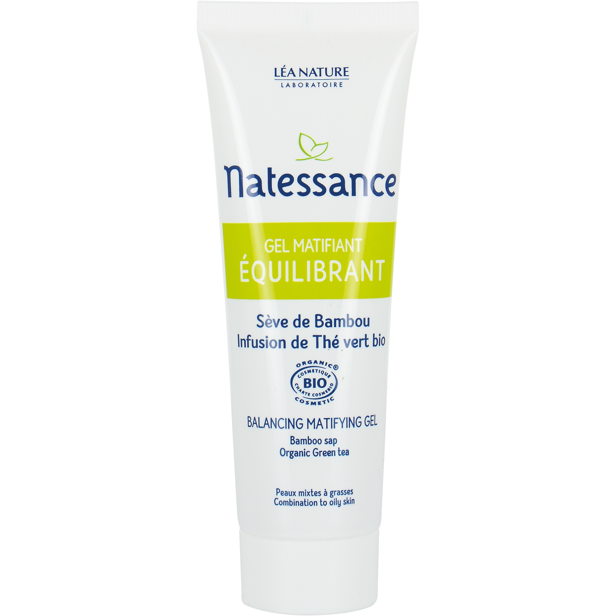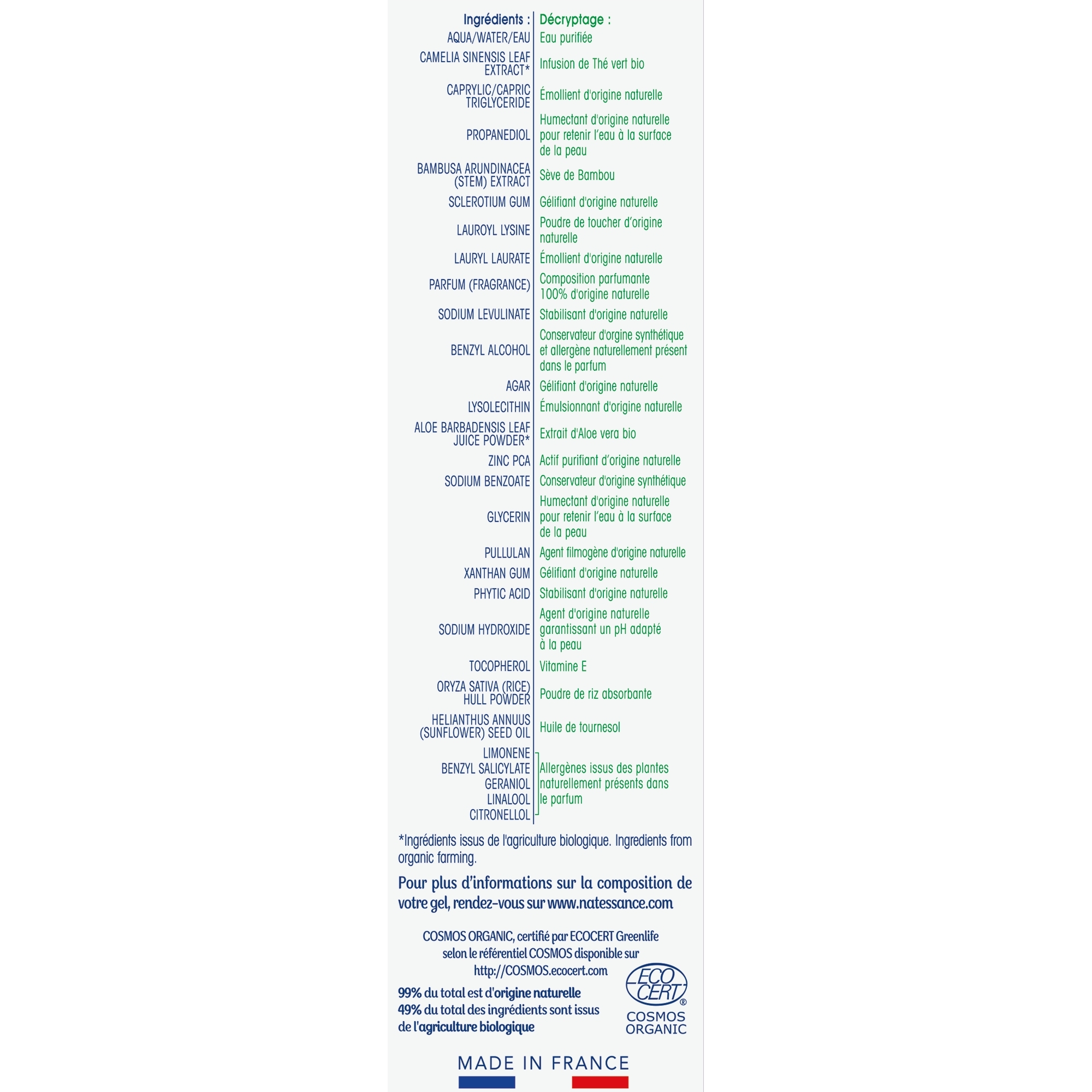 Ingrédients : AQUA /WATER/EAU - Eau purifiée CAMELIA SINENSIS LEAF EXTRACT - Infusion de Thé vert bio reconnu astringent et purifiant, issue de l'agriculture biologique d'Asie - origine végétale CAPRYLIC/CAPRIC TRIGLYCERIDE - Emollient permettant d'adoucir la peau - origine végétale PROPANEDIOL - Humectant permettant de retenir l'eau à la surface de la peau - origine biotechnologique garantie sans OGM**BAMBUSA ARUNDINACEA (STEM) EXTRACT - Sève de Bambou matifiante, issue dInde - origine végétale SCLEROTIUM GUM - Gélifiant - origine biotechnologique garantie sans OGM**LAUROYL LYSINE - Poudre de toucher - origines végétale et biotechnologique garantie sans OGM**LAURYL LAURATE - Emollient permettant d'adoucir la peau - origine végétale PARFUM (FRAGRANCE) - Composition parfumante 100% d'origine naturelle SODIUM LEVULINATE - Stabilisant permettant d'optimiser la conservation du produit - origine végétaleBENZYL ALCOHOL - Conservateur - origine synthétique AGAR - Gélifiant - origine végétale LYSOLECITHIN - Emulsionnant permettant de lier l'eau et l'huile de la crème - origine végétale ALOE BARBADENSIS LEAF JUICE POWDER - Extrait d'Aloe vera bio, issu de l'agriculture biologique du Mexique - origine végétale ZINC PCA - Actif équilibrant aidant à réguler l'excès de sébum - origines végétale et minérale SODIUM BENZOATE - Conservateur - origine synthétiqueGLYCERIN - Humectant permettant de retenir l'eau à la surface de la peau - origine végétalePULLULAN - Agent filmogène - origine biotechnologique garantie sans OGM**XANTHAN GUM - Gélifiant - origine biotechnologique garantie sans OGM**PHYTIC ACID - Agent permettant de stabiliser la formule - origine végétale SODIUM HYDROXIDE - Agent garantissant un pH adapté à la peau - origine minérale TOCOPHEROL - Vitamine E permettant de stabiliser la formule - origine végétale ORYZA SATIVA (RICE) HULL POWDER - Poudre de riz absorbante - origine végétaleHELIANTHUS ANNUUS (SUNFLOWER) SEED OIL - Huile de tournesol - origine végétaleLIMONENE - Allergènes issus des plantes naturellement présents dans le parfum - origine naturelle BENZYL SALICYLATE - Allergènes issus des plantes naturellement présents dans le parfum - origine naturelle GERANIOL - Allergènes issus des plantes naturellement présents dans le parfum - origine naturelle LINALOOL - Allergènes issus des plantes naturellement présents dans le parfum - origine naturelle BENZYL ALCOHOL - Allergènes issus des plantes naturellement présents dans le parfum - origine naturelle CITRONELLOL - Allergènes issus des plantes naturellement présents dans le parfum - origine naturelle99% du total est d'origine naturelle49% du total des ingrédients sont issus de l'agriculture biologique** Organisme Génétiquement Modifié