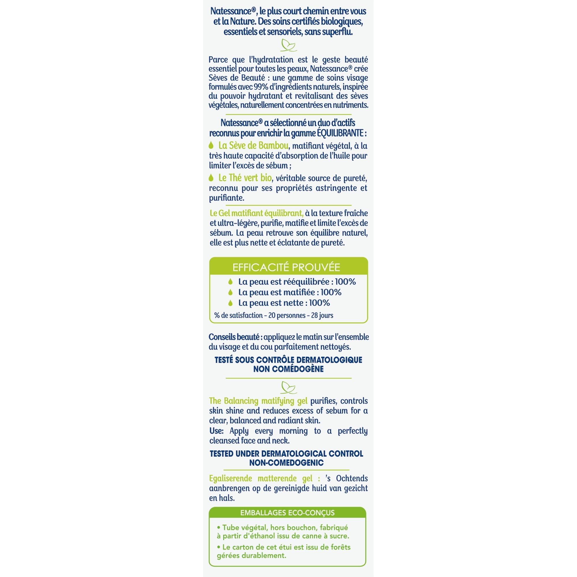 Ce gel Sèves de Beauté est composé du duo d'actifs spécifique à la gamme ÉQUILIBRANTE :- La Sève de Bambou, matifiant végétal à la très haute capacité d'absorption pour limiter l'excès de sébum- Le Thé vert bio, véritable source de pureté, reconnu pour ses propriétés astringentes et purifiantes. Le Gel matifiant Équilibrant, à la texture fraîche et ultralégère, purifie, matifie et limite l'excès de sébum. La peau retrouve son équilibre naturel, elle est plus nette et éclatante de pureté.