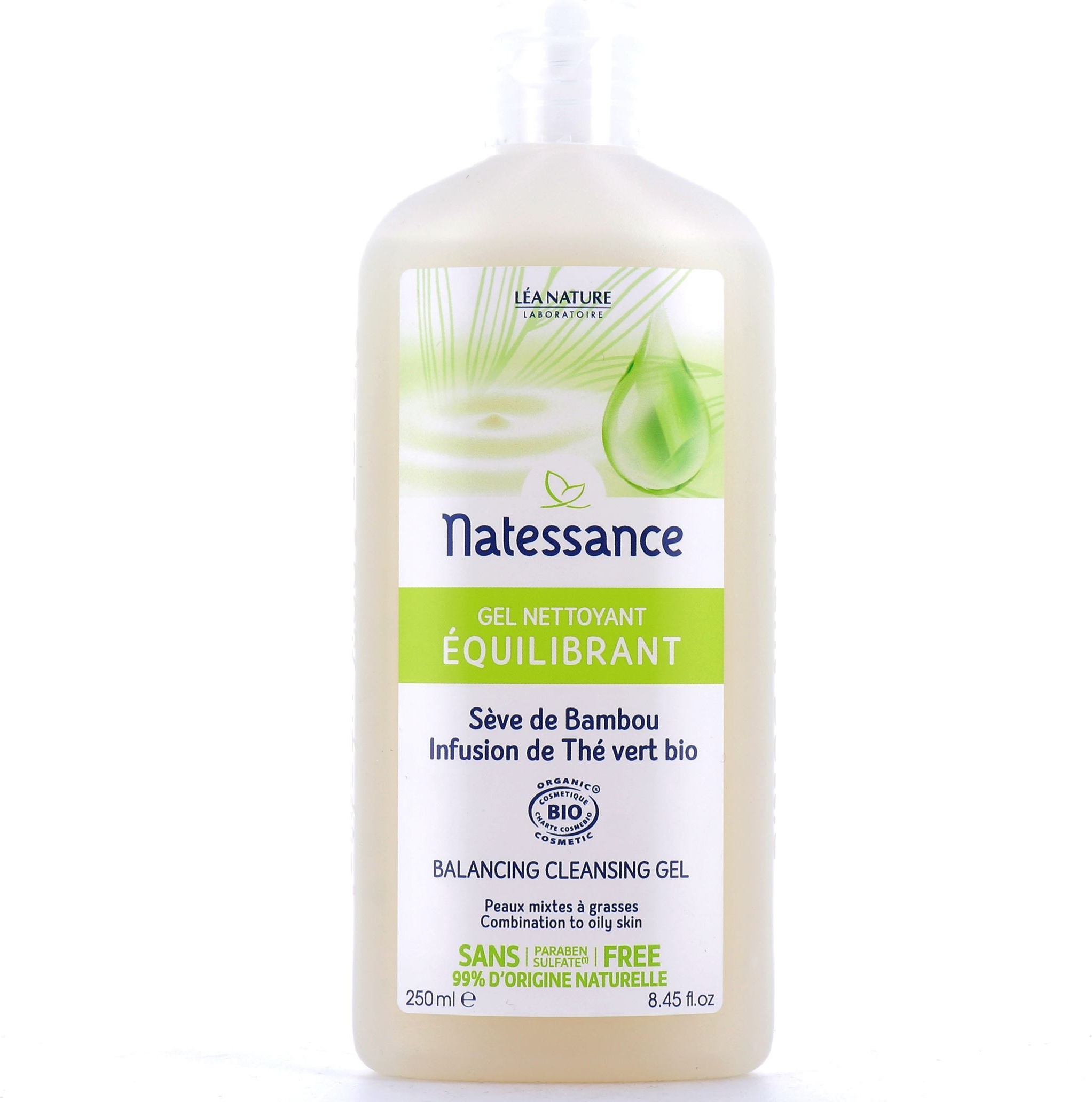 Natessance Gel Nettoyant Équilibrant 250 ml est un gel qui élimine les impuretés, les traces de maquillage et l'excès de sébum tout en purifiant la peau. Ce gel nettoyant contient : - de la Sève de Bambou, matifiant végétal à la très haute capacité d'absorption pour limiter l'excès de sébum. - du Thé Vert bio, véritable source de pureté, reconnu pour ses propriétés astringente et purifiante. Sa formule sans savon non desséchante respecte l'équilibre naturel de la peau. Elle est éclatante de pureté : fraîche et nette au quotidien. Testé sous contrôle dermatologique.