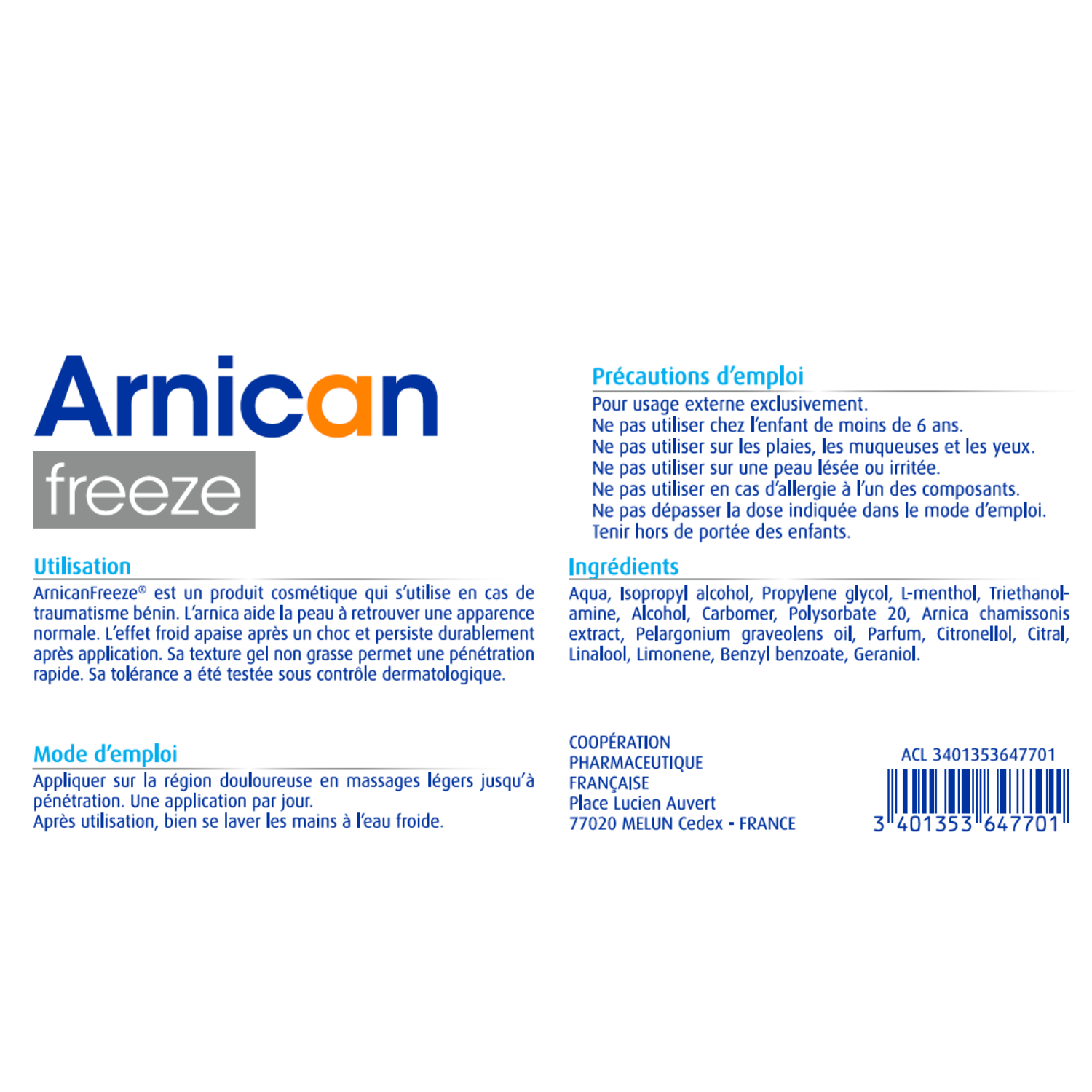 Ce produit s’utilise après un coup ou une chute. La combinaison de l’arnica et de l’action par le froid, obtenue grâce au menthol, soulage rapidement la douleur et aide la peau à retrouver une apparence normale. L’effet froid persiste après l’application pour apaiser durablement la zone touchée (jambes, bras…). Sa texture gel non grasse permet une pénétration rapide.