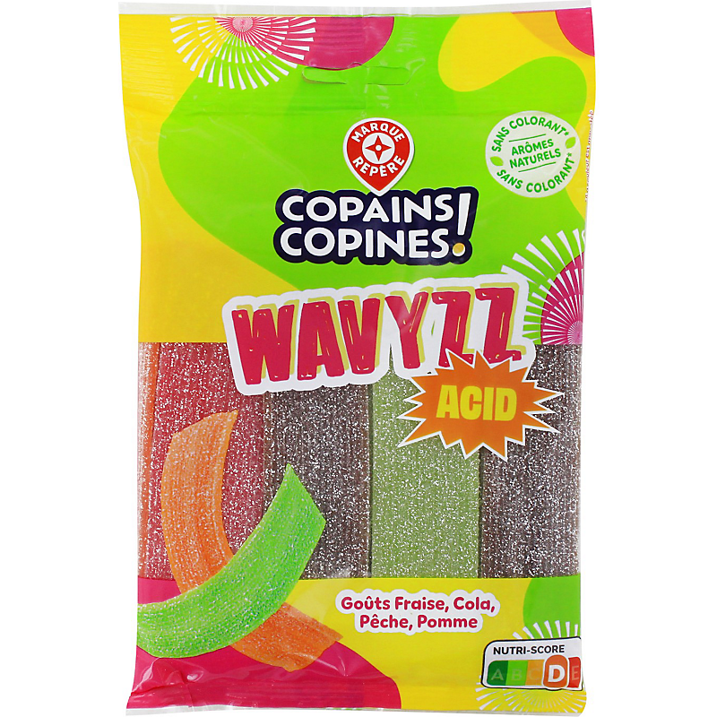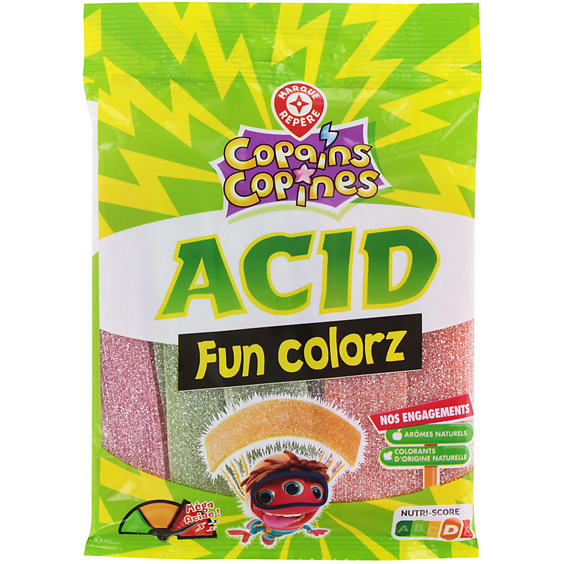 Confiseries gélifiées aromatisées avec enrobage acide goûts fraise, cola, pêche, pomme COPAINS COPINES