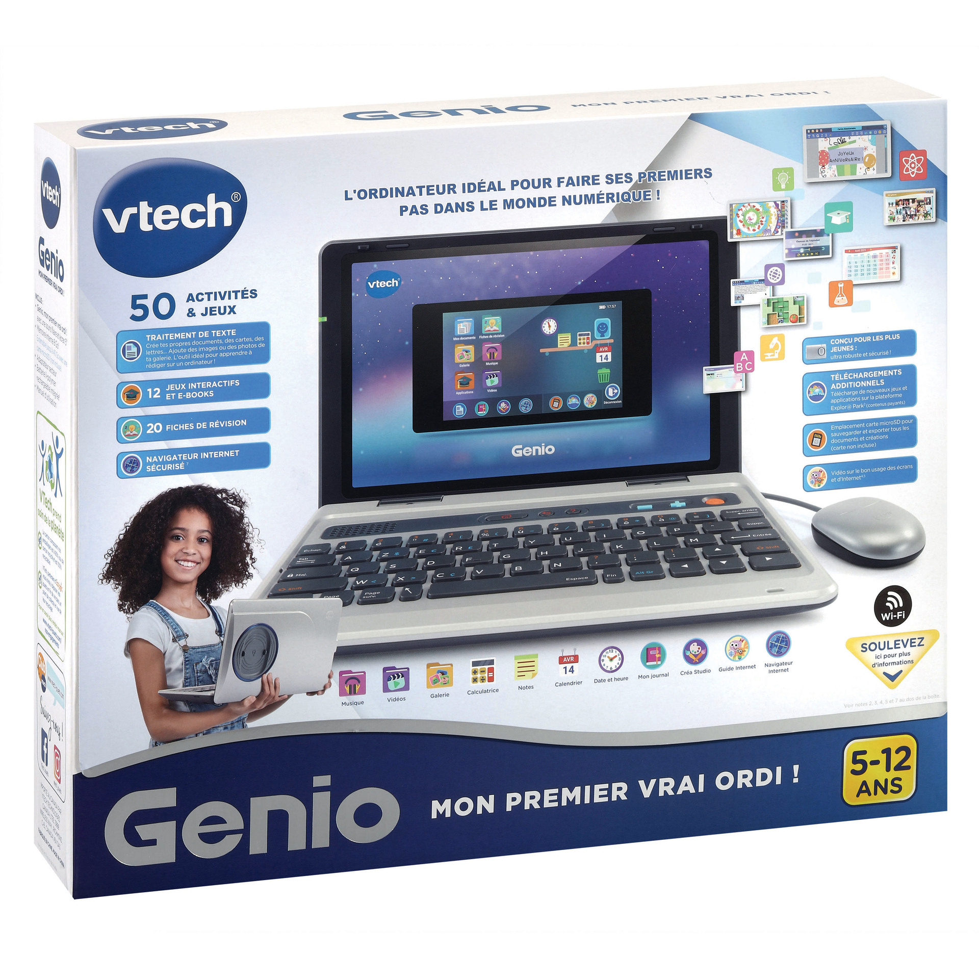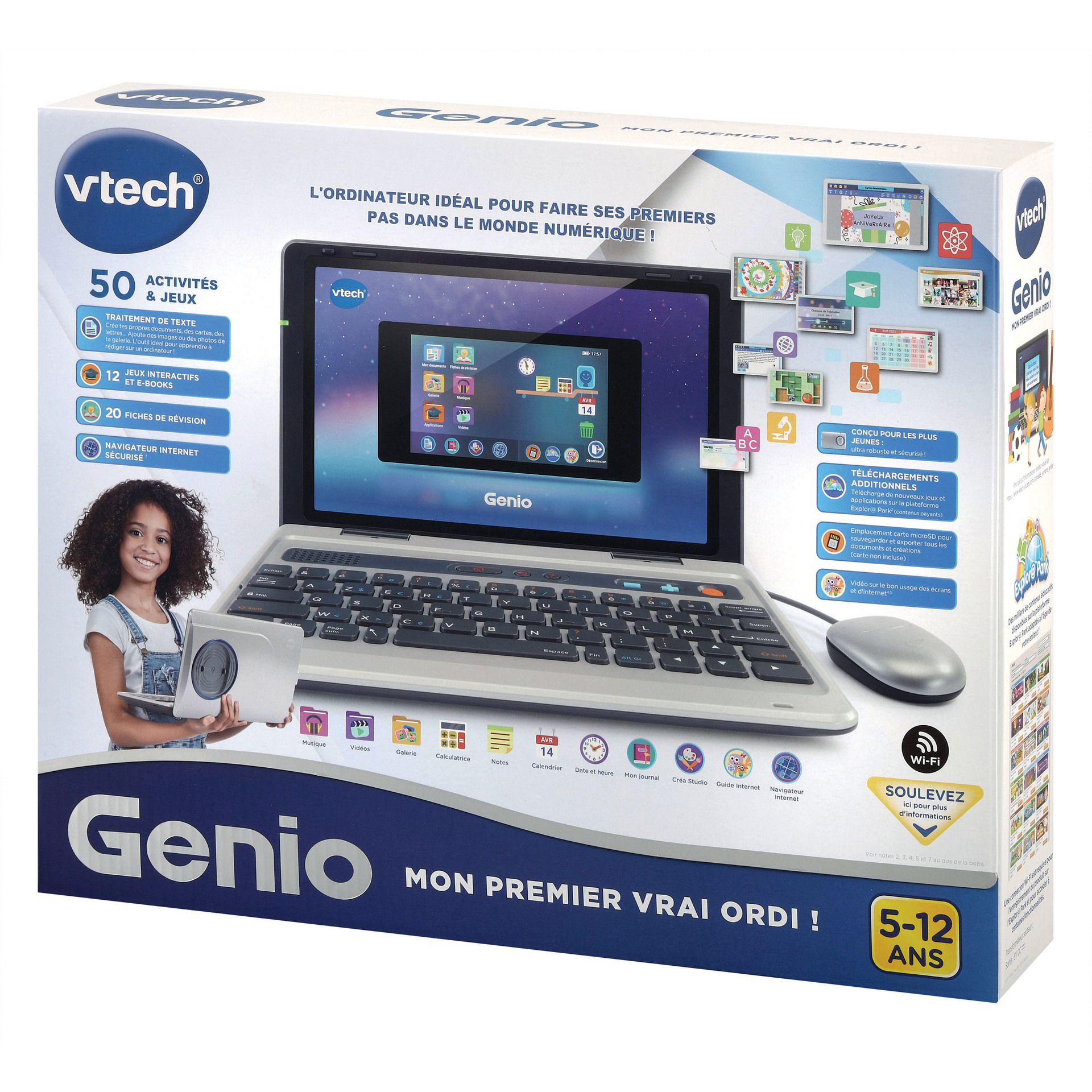 Genio, mon premier vrai ordi ! - 5 - 12 ans Genio est le premier ordinateur de l’enfant, spécialement pensé pour lui. Il reprend les codes des vrais ordinateurs : interface, clavier AZERTY, souris, écran 5’’, mémoire de 8Go extensible via carte micro-SD (non incluse). Plus de 50 activités et applications dont un vrai logiciel de traitement de texte pour faire ses devoirs et s’amuser. 20 fiches de révision incluses sur différents thèmes (mathématiques, français, sciences, histoires, etc.). L’enfant peut enregistrer son fichier en PDF, sur la carte micro-SD. Un ordinateur sécurisé : -> Navigateur internet avec liste blanche : l’enfant n’a accès qu’aux sites approuvés par ses parents -> Vidéo de sensibilisation aux données personnelles, au temps de jeu sur écran et aux dérives d’Internet et des réseaux sociaux -> Contrôles parentaux renforcés : arrêts programmés & limitation du temps de jeu L’enfant développe sa créativité avec les applications de créations artistiques. Des jeux ludo-éducatifs inclus, fonctions horloge, calculatrice, rappels et bien plus encore ! Téléchargement de contenus additionnels via l’Explor@ Park. Arrêt automatique. Boîte fenêtre. Batterie rechargeable intégrée. DAS pour la tête : 0.148 DAS pour le tronc : 0.570 DAS pour les membres : 0.735