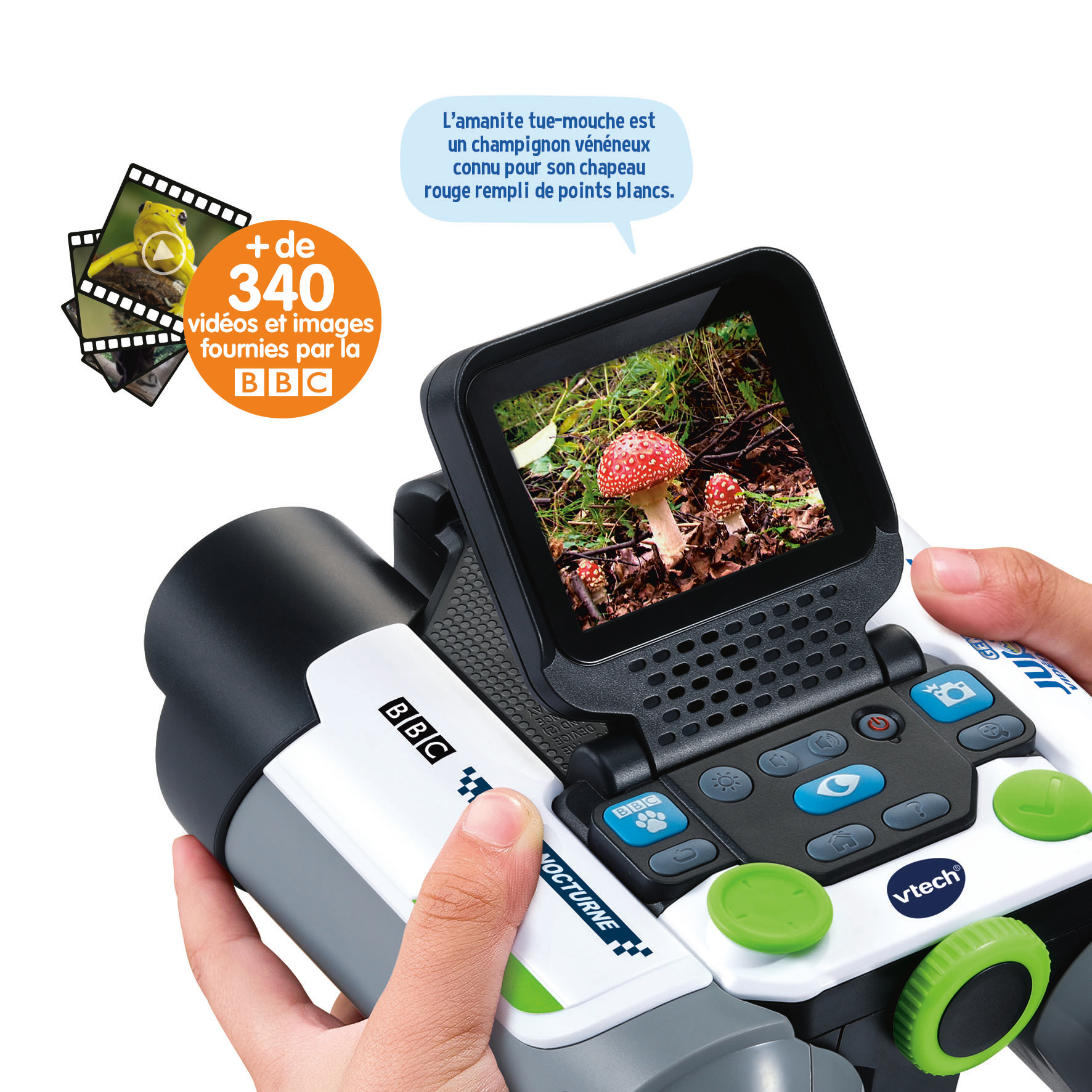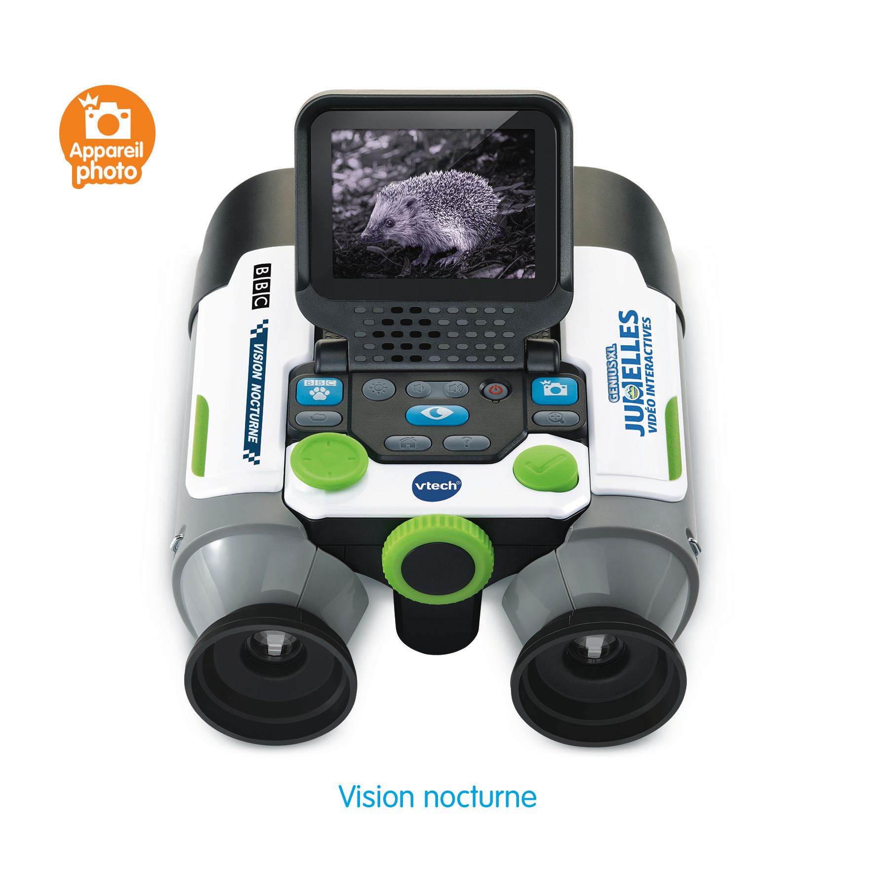 Genius XL - Jumelles vidéo interactives - 5 - 99 ans Des vraies jumelles pour un voyage au cœur de la nature et de l’observation animalière ! De véritables jumelles 10x21 avec écran couleur de 2,4’’ rabattable et distance inter-pupillaire ajustable pour un meilleur confort d’observation. 6 modes de jeu inclus pour observer et s’amuser : - Un mode Observation pour regarder la nature et les animaux jusqu’à 110m à travers les lunettes ou bien sur l’écran. - Un mode Vision nocturne avec système infrarouge intégré pour découvrir les animaux nocturnes (fonctionne uniquement sur l’écran). - Un mode Appareil photo pour mémoriser ses plus belles observations. - Du contenu interactif provenant de la BBC pour découvrir à travers 360 photos et vidéos éducatives plus de 700 informations sur les animaux, les plantes et les champignons. - Des Quiz pour tester ses connaissances à travers trois types de quiz interactifs : entraînement, contre la montre et indices. - Un mode Jeu d’aventure pour partir à la recherche d’animaux tout en apprenant des informations passionnantes. 5 environnements disponibles, avec plus de 100 animaux à trouver et 25 niveaux à explorer. 1 joystick et 12 boutons pour naviguer à travers les différents jeux et fonctionnalités. Capacité de stockage : jusqu’à 50 photos sur la mémoire interne et possibilité d’étendre la mémoire avec carte microSD non incluse. Tour de cou fourni. Arrêt automatique et réglage du volume sonore. Boîte semi-ouverte. Fonctionne avec 4 piles LR6 fournies