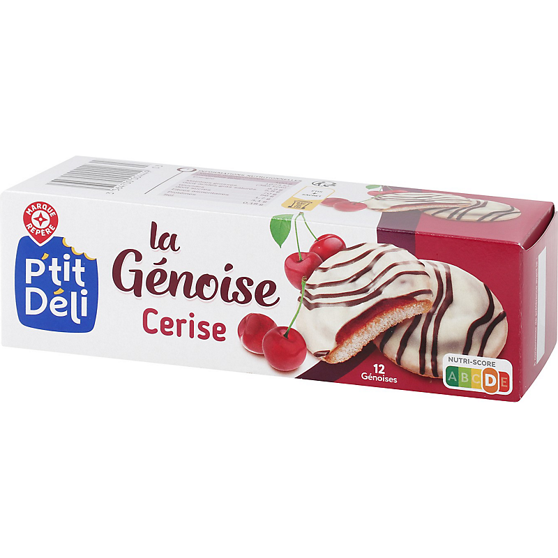 Génoises avec 55 % de fourrage à la cerise, aromatisé, nappées de chocolat blanc et de chocolat noir P'TIT DELI