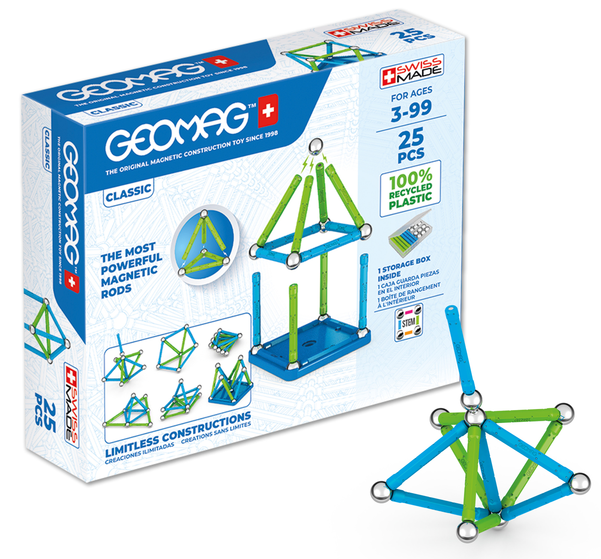 | Plus produit | Geomag est un jeu de construction magnétique qui couvre tous les éléments du STEM ou STIM : Scientifique, Technique, Ingénerie, Mathématique, qui indique une approche interdisciplinaire de l\'apprentissage Geomag est un jeu éducatif qui stimule et développe limagination, la créativité, la logique et les aptitudes manuelles, tout en facilitant la compréhension des notions complexes de la physique, comme la création de champs magnétiques et les forces dattraction et de répulsion Grâce aux aimants placés à leurs deux extrémités, les barrettes se connectent aux sphères, vous permettant de construire tout ce qui vous passe par la tête, la gamme Geomag Color est le meilleur moyen dentrer dans le monde fascinant et amusant de Geomag, un monde magique et surprenant, composé de créations en mouvement, de couleurs vives et dincroyables forces magnétiques Geomag est composé de 100% de plastique recyclé et avec des sphères 100% recyclable et aimants 100% recyclable. Realiser des constructions en 2D ou 3D.\nInclut 12 barres Geomag, 12 Spheres et 1 base de construction. A partir de 3 ans |