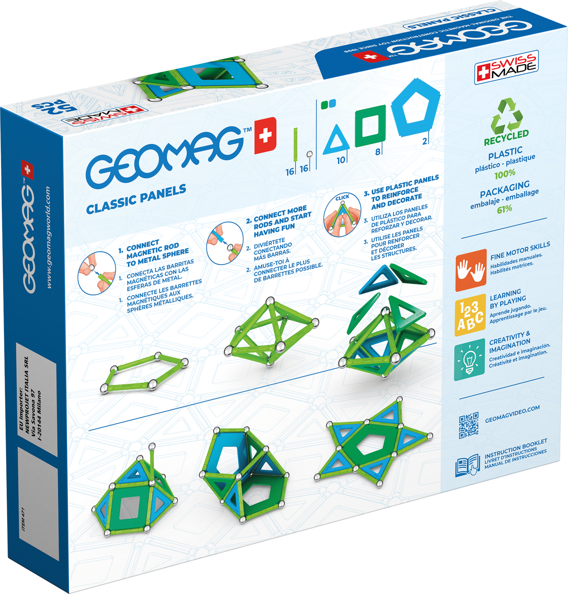 | Plus produit | Geomag est un jeu de construction magnétique qui couvre tous les éléments du STEM ou STIM : Scientifique, Technique, Ingénerie, Mathématique, qui indique une approche interdisciplinaire de l\'apprentissage Geomag est un jeu éducatif qui stimule et développe limagination, la créativité, la logique et les aptitudes manuelles, tout en facilitant la compréhension des notions complexes de la physique, comme la création de champs magnétiques et les forces dattraction et de répulsion Grâce aux aimants placés à leurs deux extrémités, les barrettes se connectent aux sphères, vous permettant de construire tout ce qui vous passe par la tête, la gamme Geomag panels permet de renforcer les constructions pour aller encore plus loin dans la créativité. Geomag est un monde fascinant et amusant, un monde magique et surprenant, composé de créations en mouvement, de couleurs vives et dincroyables forces magnétiques Geomag est composé de 100% de plastique recyclé et avec des sphères 100% recyclable et aimants 100% recyclable. Realiser des constructions en 2D ou 3D.\nInclut 16 barres Geomag, 16 Spheres et 20 Panels. A partir de 5 ans |
